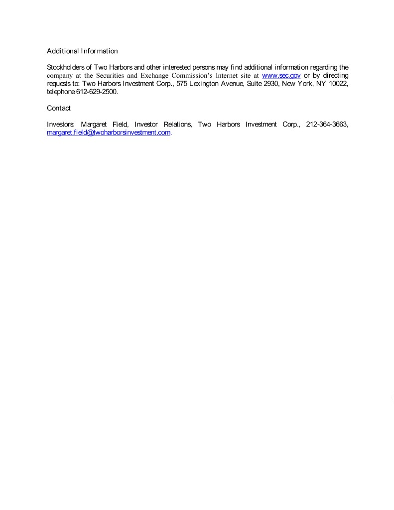 Additional Information Stockholders of Two Harbors and other interested persons may find additional information regarding the company at the Securities and Exchange Commission’s Internet site at www.sec.gov or by directing requests to: Two Harbors Investment Corp., 575 Lexington Avenue, Suite 2930, New York, NY 10022, telephone 612-629-2500. Contact Investors: Margaret Field, Investor Relations, Two Harbors Investment Corp., 212-364-3663, margaret.field@twoharborsinvestment.com.