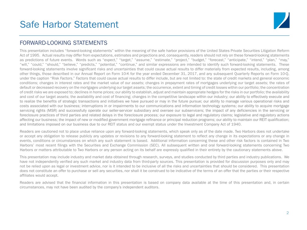 Safe Harbor Statement FORWARD-LOOKING STATEMENTS This presentation includes “forward-looking statements” within the meaning of the safe harbor provisions of the United States Private Securities Litigation Reform Act of 1995. Actual results may differ from expectations, estimates and projections and, consequently, readers should not rely on these forward-looking statements as predictions of future events. Words such as “expect,” “target,” “assume,” “estimate,” “project,” “budget,” “forecast,” “anticipate,” “intend,” “plan,” “may,” “will,” “could,” “should,” “believe,” “predicts,” “potential,” “continue,” and similar expressions are intended to identify such forward-looking statements. These forward-looking statements involve significant risks and uncertainties that could cause actual results to differ materially from expected results, including, among other things, those described in our Annual Report on Form 10-K for the year ended December 31, 2017, and any subsequent Quarterly Reports on Form 10-Q, under the caption “Risk Factors.” Factors that could cause actual results to differ include, but are not limited to: the state of credit markets and general economic conditions; changes in interest rates and the market value of our assets; changes in prepayment rates of mortgages underlying our target assets; the rates of default or decreased recovery on the mortgages underlying our target assets; the occurrence, extent and timing of credit losses within our portfolio; the concentration of credit risks we are exposed to; declines in home prices; our ability to establish, adjust and maintain appropriate hedges for the risks in our portfolio; the availability and cost of our target assets; the availability and cost of financing; changes in the competitive landscape within our industry; our ability to effectively execute and to realize the benefits of strategic transactions and initiatives we have pursued or may in the future pursue; our ability to manage various operational risks and costs associated with our business; interruptions in or impairments to our communications and information technology systems; our ability to acquire mortgage servicing rights (MSR) and successfully operate our seller-servicer subsidiary and oversee our subservicers; the impact of any deficiencies in the servicing or foreclosure practices of third parties and related delays in the foreclosure process; our exposure to legal and regulatory claims; legislative and regulatory actions affecting our business; the impact of new or modified government mortgage refinance or principal reduction programs; our ability to maintain our REIT qualification; and limitations imposed on our business due to our REIT status and our exempt status under the Investment Company Act of 1940. Readers are cautioned not to place undue reliance upon any forward-looking statements, which speak only as of the date made. Two Harbors does not undertake or accept any obligation to release publicly any updates or revisions to any forward-looking statement to reflect any change in its expectations or any change in events, conditions or circumstances on which any such statement is based. Additional information concerning these and other risk factors is contained in Two Harbors’ most recent filings with the Securities and Exchange Commission (SEC). All subsequent written and oral forward-looking statements concerning Two Harbors or matters attributable to Two Harbors or any person acting on its behalf are expressly qualified in their entirety by the cautionary statements above. This presentation may include industry and market data obtained through research, surveys, and studies conducted by third parties and industry publications. We have not independently verified any such market and industry data from third-party sources. This presentation is provided for discussion purposes only and may not be relied upon as legal or investment advice, nor is it intended to be inclusive of all the risks and uncertainties that should be considered. This presentation does not constitute an offer to purchase or sell any securities, nor shall it be construed to be indicative of the terms of an offer that the parties or their respective affiliates would accept. Readers are advised that the financial information in this presentation is based on company data available at the time of this presentation and, in certain circumstances, may not have been audited by the company’s independent auditors. 2