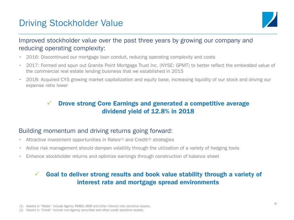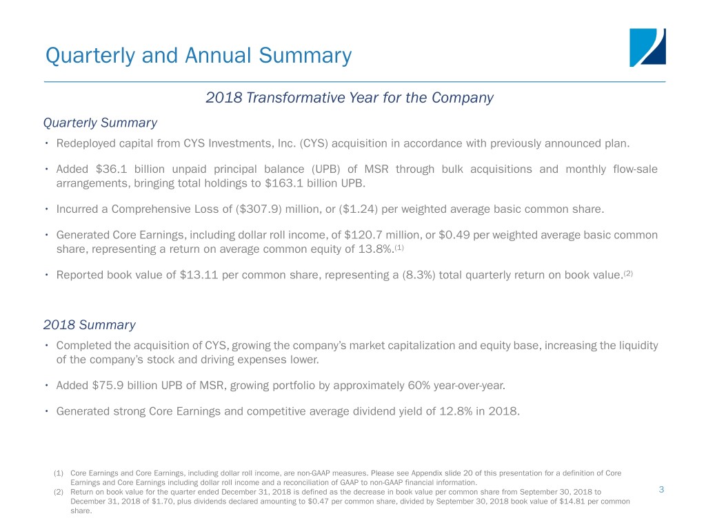 Quarterly and Annual Summary 2018 Transformative Year for the Company Quarterly Summary • Redeployed capital from CYS Investments, Inc. (CYS) acquisition in accordance with previously announced plan. • Added $36.1 billion unpaid principal balance (UPB) of MSR through bulk acquisitions and monthly flow-sale arrangements, bringing total holdings to $163.1 billion UPB. • Incurred a Comprehensive Loss of ($307.9) million, or ($1.24) per weighted average basic common share. • Generated Core Earnings, including dollar roll income, of $120.7 million, or $0.49 per weighted average basic common share, representing a return on average common equity of 13.8%.(1) • Reported book value of $13.11 per common share, representing a (8.3%) total quarterly return on book value.(2) 2018 Summary • Completed the acquisition of CYS, growing the company’s market capitalization and equity base, increasing the liquidity of the company’s stock and driving expenses lower. • Added $75.9 billion UPB of MSR, growing portfolio by approximately 60% year-over-year. • Generated strong Core Earnings and competitive average dividend yield of 12.8% in 2018. (1) Core Earnings and Core Earnings, including dollar roll income, are non-GAAP measures. Please see Appendix slide 20 of this presentation for a definition of Core Earnings and Core Earnings including dollar roll income and a reconciliation of GAAP to non-GAAP financial information. (2) Return on book value for the quarter ended December 31, 2018 is defined as the decrease in book value per common share from September 30, 2018 to 3 December 31, 2018 of $1.70, plus dividends declared amounting to $0.47 per common share, divided by September 30, 2018 book value of $14.81 per common share.