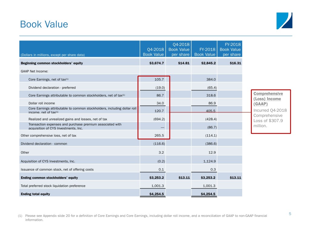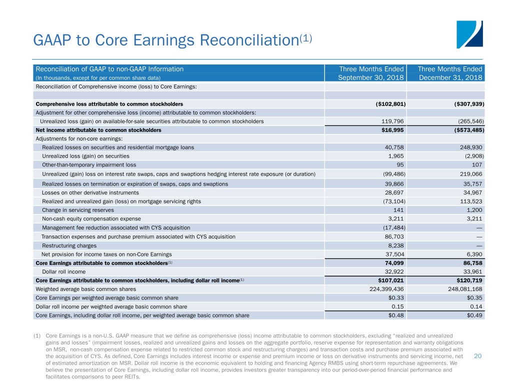 GAAP to Core Earnings Reconciliation(1) Reconciliation of GAAP to non-GAAP Information Three Months Ended Three Months Ended (In thousands, except for per common share data) September 30, 2018 December 31, 2018 Reconciliation of Comprehensive income (loss) to Core Earnings: Comprehensive loss attributable to common stockholders ($102,801) ($307,939) Adjustment for other comprehensive loss (income) attributable to common stockholders: Unrealized loss (gain) on available-for-sale securities attributable to common stockholders 119,796 (265,546) Net income attributable to common stockholders $16,995 ($573,485) Adjustments for non-core earnings: Realized losses on securities and residential mortgage loans 40,758 248,930 Unrealized loss (gain) on securities 1,965 (2,908) Other-than-temporary impairment loss 95 107 Unrealized (gain) loss on interest rate swaps, caps and swaptions hedging interest rate exposure (or duration) (99,486) 219,066 Realized losses on termination or expiration of swaps, caps and swaptions 39,866 35,757 Losses on other derivative instruments 28,697 34,967 Realized and unrealized gain (loss) on mortgage servicing rights (73,104) 113,523 Change in servicing reserves 141 1,200 Non-cash equity compensation expense 3,211 3,211 Management fee reduction associated with CYS acquisition (17,484) — Transaction expenses and purchase premium associated with CYS acquisition 86,703 — Restructuring charges 8,238 — Net provision for income taxes on non-Core Earnings 37,504 6,390 Core Earnings attributable to common stockholders(1) 74,099 86,758 Dollar roll income 32,922 33,961 Core Earnings attributable to common stockholders, including dollar roll income(1) $107,021 $120,719 Weighted average basic common shares 224,399,436 248,081,168 Core Earnings per weighted average basic common share $0.33 $0.35 Dollar roll income per weighted average basic common share 0.15 0.14 Core Earnings, including dollar roll income, per weighted average basic common share $0.48 $0.49 (1) Core Earnings is a non-U.S. GAAP measure that we define as comprehensive (loss) income attributable to common stockholders, excluding “realized and unrealized gains and losses” (impairment losses, realized and unrealized gains and losses on the aggregate portfolio, reserve expense for representation and warranty obligations on MSR, non-cash compensation expense related to restricted common stock and restructuring charges) and transaction costs and purchase premium associated with the acquisition of CYS. As defined, Core Earnings includes interest income or expense and premium income or loss on derivative instruments and servicing income, net 20 of estimated amortization on MSR. Dollar roll income is the economic equivalent to holding and financing Agency RMBS using short-term repurchase agreements. We believe the presentation of Core Earnings, including dollar roll income, provides investors greater transparency into our period-over-period financial performance and facilitates comparisons to peer REITs.