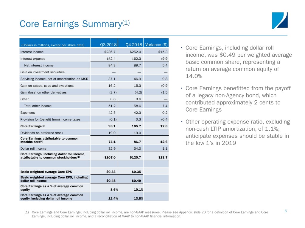 Book Value Q4-2018 FY-2018 Q4-2018 Book Value FY-2018 Book Value (Dollars in millions, except per share data) Book Value per share Book Value per share Beginning common stockholders’ equity $3,674.7 $14.81 $2,845.2 $16.31 GAAP Net Income: Core Earnings, net of tax(1) 105.7 384.0 Dividend declaration - preferred (19.0) (65.4) Core Earnings attributable to common stockholders, net of tax(1) 86.7 318.6 Comprehensive (Loss) Income Dollar roll income 34.0 86.9 (GAAP) Core Earnings attributable to common stockholders, including dollar roll income, net of tax(1) 120.7 405.5 Incurred Q4-2018 Comprehensive Realized and unrealized gains and losses, net of tax (694.2) (428.4) Loss of $307.9 Transaction expenses and purchase premium associated with million. acquisition of CYS Investments, Inc. — (86.7) Other comprehensive loss, net of tax 265.5 (114.1) Dividend declaration - common (116.6) (386.6) Other 3.2 12.9 Acquisition of CYS Investments, Inc. (0.2) 1,124.9 Issuance of common stock, net of offering costs 0.1 0.3 Ending common stockholders’ equity $3,253.2 $13.11 $3,253.2 $13.11 Total preferred stock liquidation preference 1,001.3 1,001.3 Ending total equity $4,254.5 $4,254.5 (1) Please see Appendix slide 20 for a definition of Core Earnings and Core Earnings, including dollar roll income, and a reconciliation of GAAP to non-GAAP financial 5 information.