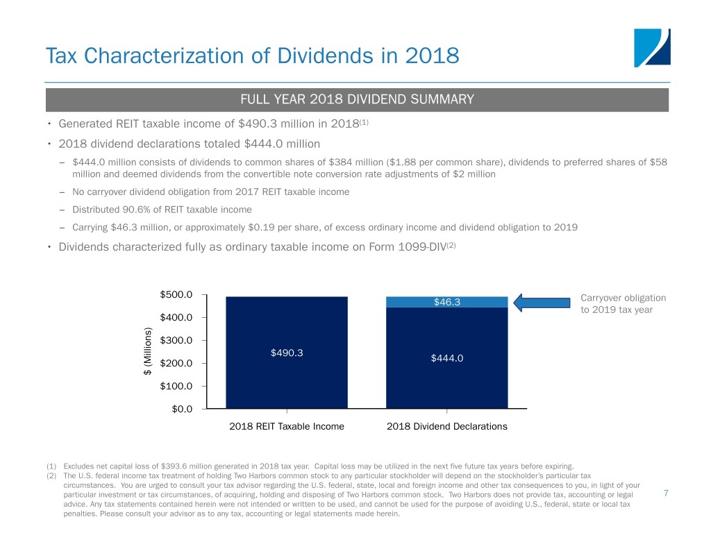 Tax Characterization of Dividends in 2018 FULL YEAR 2018 DIVIDEND SUMMARY • Generated REIT taxable income of $490.3 million in 2018(1) • 2018 dividend declarations totaled $444.0 million – $444.0 million consists of dividends to common shares of $384 million ($1.88 per common share), dividends to preferred shares of $58 million and deemed dividends from the convertible note conversion rate adjustments of $2 million – No carryover dividend obligation from 2017 REIT taxable income – Distributed 90.6% of REIT taxable income – Carrying $46.3 million, or approximately $0.19 per share, of excess ordinary income and dividend obligation to 2019 • Dividends characterized fully as ordinary taxable income on Form 1099-DIV(2) $500.0 $46.3 Carryover obligation to 2019 tax year $400.0 ) s n $300.0 o i l l i $490.3 $444.0 M ( $200.0 $ $100.0 $0.0 2018 REIT Taxable Income 2018 Dividend Declarations (1) Excludes net capital loss of $393.6 million generated in 2018 tax year. Capital loss may be utilized in the next five future tax years before expiring. (2) The U.S. federal income tax treatment of holding Two Harbors common stock to any particular stockholder will depend on the stockholder’s particular tax circumstances. You are urged to consult your tax advisor regarding the U.S. federal, state, local and foreign income and other tax consequences to you, in light of your particular investment or tax circumstances, of acquiring, holding and disposing of Two Harbors common stock. Two Harbors does not provide tax, accounting or legal 7 advice. Any tax statements contained herein were not intended or written to be used, and cannot be used for the purpose of avoiding U.S., federal, state or local tax penalties. Please consult your advisor as to any tax, accounting or legal statements made herein.