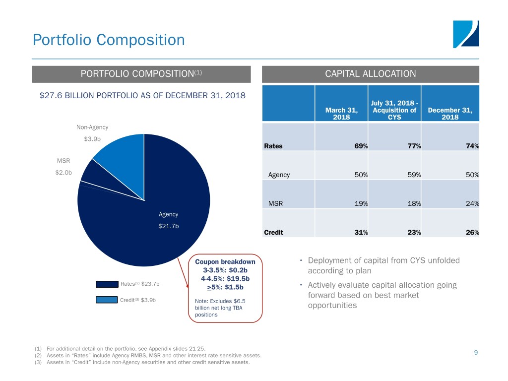 Optimizing Financing Profile and Capital Structure DEBT-TO-EQUITY • 5.8x debt-to-equity at December 31, 2018(1) • Economic debt-to-equity, which includes the implied debt on net to-be-announced (TBA) positions, of 7.2x at December 31, 2018, compared to 7.3x at September 30, 2018(2) PREFERRED STOCK • $1.0 billion outstanding across all preferred series with weighted average dividend rate of 7.6% • Accounts for approximately 24% of capital base RATES – AGENCY RMBS • Outstanding repurchase agreements of $20.1 billion with 29 active counterparties • Outstanding secured FHLB advances of $865.0 million with weighted average borrowing rate of 2.79% • Repo markets functioning efficiently for RMBS with new counterparties entering market CREDIT – NON-AGENCY SECURITIES • Outstanding borrowings of $2.7 billion with 12 active counterparties • Market for non-Agency securities has seen improvement in both advance rates and spreads; spreads came down about 40 basis points in 2018 RATES – MSR • Outstanding borrowings of $610.0 million under MSR financing facilities; additional available capacity of $160.0 million • Continue to advance MSR financing discussions with additional counterparties 8 (1) Defined as total borrowings to fund RMBS, MSR and Agency Derivatives, divided by total equity. (2) Defined as total borrowings to fund RMBS, MSR and Agency Derivatives, plus the implied debt on net TBA positions, divided by total equity.