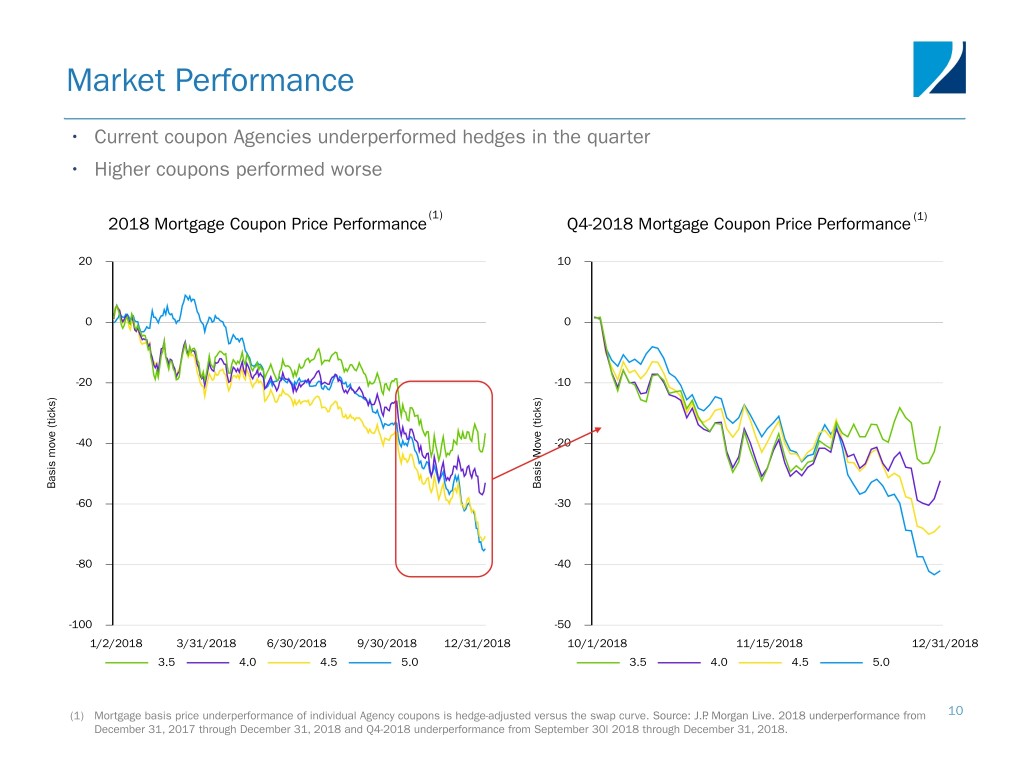 Market Performance • Current coupon Agencies underperformed hedges in the quarter • Higher coupons performed worse (1) 2018 Mortgage Coupon Price Performance Q4-2018 Mortgage Coupon Price Performance (1) 20 10 0 0 -20 -10 ) ) s s k k c c i i t t ( ( e e v v o -40 o -20 m M s s i i s s a a B B -60 -30 -80 -40 -100 -50 1/2/2018 3/31/2018 6/30/2018 9/30/2018 12/31/2018 10/1/2018 11/15/2018 12/31/2018 3.5 4.0 4.5 5.0 3.5 4.0 4.5 5.0 (1) Mortgage basis price underperformance of individual Agency coupons is hedge-adjusted versus the swap curve. Source: J.P. Morgan Live. 2018 underperformance from 10 December 31, 2017 through December 31, 2018 and Q4-2018 underperformance from September 30l 2018 through December 31, 2018.