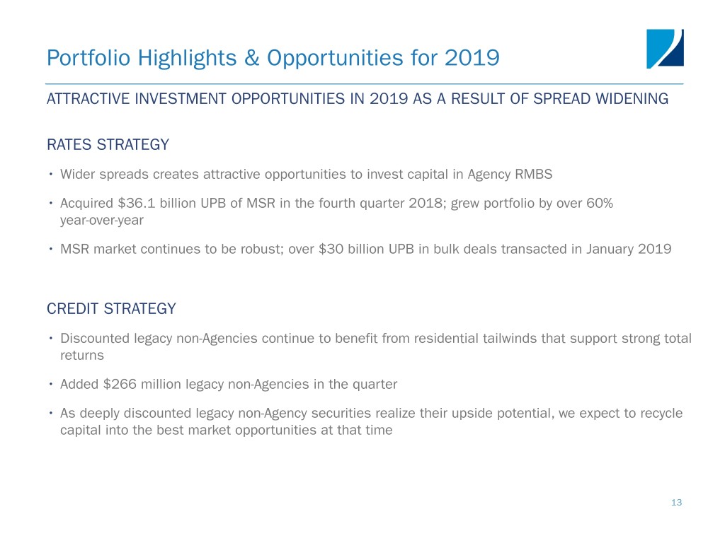 Performance Summary • Net interest margin benefitted from purchases of Agency pools at attractive yields • MSR benefitted from slower prepayment speeds and higher interest rate environment • Non-Agency yields stable Three Months Ended September 30, 2018 December 31, 2018 Annualized portfolio yield during the quarter 3.76% 4.14% Rates Agency RMBS, Agency Derivatives and MSR 3.3% 3.6% Credit Non-Agency securities, Legacy(1) 7.6% 7.7% Non-Agency securities, New issue(1) 5.4% 7.8% Annualized cost of funds on average borrowings during the quarter(2) 2.28% 2.53% Annualized interest rate spread for aggregate portfolio during the quarter 1.48% 1.61% 12 (1) “Legacy” non-Agency securities includes non-Agency bonds issued up to and including 2009. “New issue” non-Agency securities includes bonds issued after 2009. (2) Cost of funds includes interest spread income/expense associated with the portfolio’s interest rate swaps and caps.