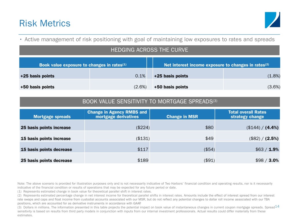 Risk Metrics • Active management of risk positioning with goal of maintaining low exposures to rates and spreads HEDGING ACROSS THE CURVE Book value exposure to changes in rates(1) Net interest income exposure to changes in rates(2) +25 basis points 0.1% +25 basis points (1.8%) +50 basis points (2.6%) +50 basis points (3.6%) BOOK VALUE SENSITIVITY TO MORTGAGE SPREADS(3) Change in Agency RMBS and Total overall Rates Mortgage spreads mortgage derivatives Change in MSR strategy change 25 basis points increase ($224) $80 ($144) / (4.4%) 15 basis points increase ($131) $49 ($82) / (2.5%) 15 basis points decrease $117 ($54) $63 / 1.9% 25 basis points decrease $189 ($91) $98 / 3.0% Note: The above scenario is provided for illustration purposes only and is not necessarily indicative of Two Harbors’ financial condition and operating results, nor is it necessarily indicative of the financial condition or results of operations that may be expected for any future period or date. (1) Represents estimated change in book value for theoretical parallel shift in interest rates. (2) Represents estimated percentage change in net interest income for theoretical parallel shifts in interest rates. Amounts include the effect of interest spread from our interest rate swaps and caps and float income from custodial accounts associated with our MSR, but do not reflect any potential changes to dollar roll income associated with our TBA positions, which are accounted for as derivative instruments in accordance with GAAP. (3) Dollars in millions. The information presented in this table projects the potential impact on book value of instantaneous changes in current coupon mortgage spreads. Spread14 sensitivity is based on results from third party models in conjunction with inputs from our internal investment professionals. Actual results could differ materially from these estimates.