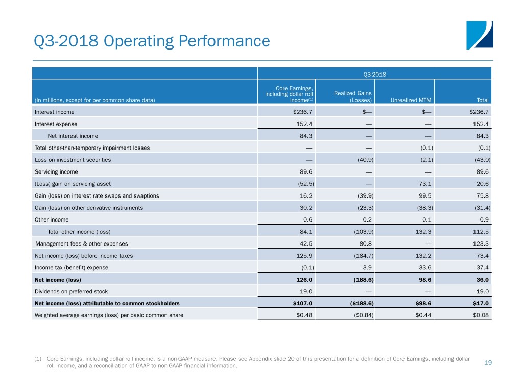 Q4-2018 Operating Performance Q4-2018 Core Earnings, including dollar roll Realized Gains (In millions, except for per common share data) income(1) (Losses) Unrealized MTM Total Interest income $252.0 $— $— $252.0 Interest expense 162.3 — — 162.3 Net interest income 89.7 — — 89.7 Total other-than-temporary impairment losses — — (0.1) (0.1) (Loss) gain on investment securities — (248.8) 3.1 (245.7) Servicing income 104.6 — — 104.6 (Loss) gain on servicing asset (57.7) 0.2 (113.8) (171.3) Gain (loss) on interest rate swaps, caps and swaptions 15.3 (35.7) (219.1) (239.5) Gain (loss) on other derivative instruments 29.8 (38.9) (30.0) (39.1) Other income (loss) 0.6 (0.1) (0.2) 0.3 Total other income (loss) 92.6 (323.3) (360.1) (590.8) Management fees & other expenses 42.3 4.4 — 46.7 Net income (loss) before income taxes 140.0 (327.7) (360.1) (547.8) Income tax expense (benefit) 0.3 (0.2) 6.6 6.7 Net income (loss) 139.7 (327.5) (366.7) (554.5) Dividends on preferred stock 19.0 — — 19.0 Net income (loss) attributable to common stockholders $120.7 ($327.5) ($366.7) ($573.5) Weighted average earnings (loss) per basic common share $0.49 ($1.32) ($1.48) ($2.31) (1) Core Earnings, including dollar roll income, is a non-GAAP measure. Please see Appendix slide 20 of this presentation for a definition of Core Earnings, including dollar roll income, and a reconciliation of GAAP to non-GAAP financial information. 18