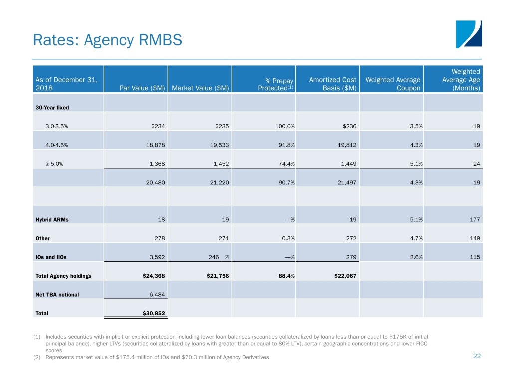 Rates: Agency RMBS Metrics AGENCY PORTFOLIO YIELDS AND METRICS AGENCY PORTFOLIO COMPOSITION Hybrid ARMs and IO & Inverse IO Other Realized At September Realized At December Portfolio Yield Q3-2018 30, 2018 Q4-2018 31, 2018 30-Year Fixed 1.1% 1.3% 5% & above Agency yield 3.1% 3.4% 3.3% 3.5% 6.7% Repo and FHLB costs (2.3%) (2.3%) (2.5%) (2.5%) 30-Year Fixed 3-3.5% Swap and cap income 0.3% 0.4% 0.3% 0.6% 1.1% Net interest spread 1.1% 1.5% 1.1% 1.6% Portfolio Metrics Q3-2018 Q4-2018 30-Year Fixed 4-4.5% 89.8% Weighted average 3-month CPR(1) 8.1% 6.8% Weighted average cost basis(2) $105.2 $105.2 AGENCY RMBS CPR(1) 15.0% 9.2% 10.0% 7.6% 8.1% 7.0% 6.8% 5.0% 0.0% Q4-2017 Q1-2018 Q2-2018 Q3-2018 Q4-2018 (1) Agency weighted average 3-month Constant Prepayment Rate (CPR) includes IIOs (or Agency Derivatives). 21 (2) Weighted average cost basis includes RMBS principal and interest securities only. Average purchase price utilized carrying value for weighting purposes.