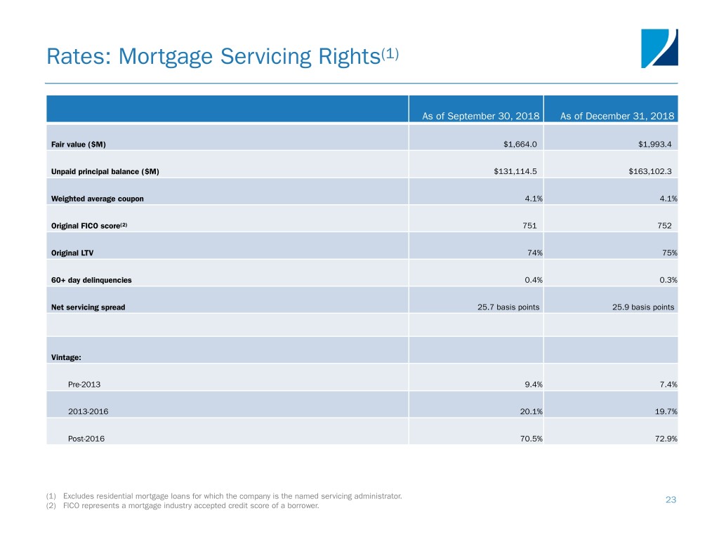 Rates: Mortgage Servicing Rights(1) As of September 30, 2018 As of December 31, 2018 Fair value ($M) $1,664.0 $1,993.4 Unpaid principal balance ($M) $131,114.5 $163,102.3 Weighted average coupon 4.1% 4.1% Original FICO score(2) 751 752 Original LTV 74% 75% 60+ day delinquencies 0.4% 0.3% Net servicing spread 25.7 basis points 25.9 basis points Vintage: Pre-2013 9.4% 7.4% 2013-2016 20.1% 19.7% Post-2016 70.5% 72.9% (1) Excludes residential mortgage loans for which the company is the named servicing administrator. 23 (2) FICO represents a mortgage industry accepted credit score of a borrower.