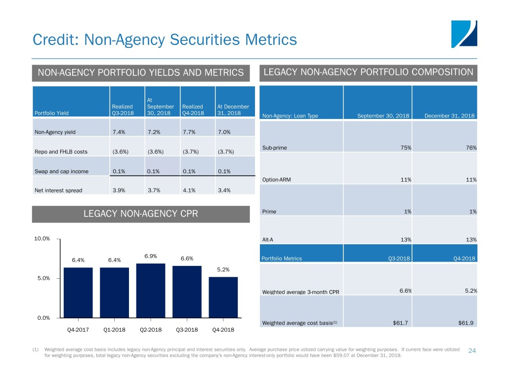 Credit: Non-Agency Securities Metrics NON-AGENCY PORTFOLIO YIELDS AND METRICS LEGACY NON-AGENCY PORTFOLIO COMPOSITION At Realized September Realized At December Portfolio Yield Q3-2018 30, 2018 Q4-2018 31, 2018 Non-Agency: Loan Type September 30, 2018 December 31, 2018 Non-Agency yield 7.4% 7.2% 7.7% 7.0% Sub-prime 75% 76% Repo and FHLB costs (3.6%) (3.6%) (3.7%) (3.7%) Swap and cap income 0.1% 0.1% 0.1% 0.1% Option-ARM 11% 11% Net interest spread 3.9% 3.7% 4.1% 3.4% LEGACY NON-AGENCY CPR Prime 1% 1% 10.0% Alt-A 13% 13% 6.9% 6.4% 6.4% 6.6% Portfolio Metrics Q3-2018 Q4-2018 5.2% 5.0% Weighted average 3-month CPR 6.6% 5.2% 0.0% Weighted average cost basis(1) $61.7 $61.9 Q4-2017 Q1-2018 Q2-2018 Q3-2018 Q4-2018 (1) Weighted average cost basis includes legacy non-Agency principal and interest securities only. Average purchase price utilized carrying value for weighting purposes. If current face were utilized 24 for weighting purposes, total legacy non-Agency securities excluding the company’s non-Agency interest-only portfolio would have been $59.07 at December 31, 2018.