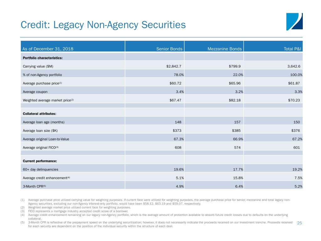 Credit: Legacy Non-Agency Securities As of December 31, 2018 Senior Bonds Mezzanine Bonds Total P&I Portfolio characteristics: Carrying value ($M) $2,842.7 $799.9 3,642.6 % of non-Agency portfolio 78.0% 22.0% 100.0% Average purchase price(1) $60.72 $65.96 $61.87 Average coupon 3.4% 3.2% 3.3% Weighted average market price(2) $67.47 $82.18 $70.23 Collateral attributes: Average loan age (months) 148 157 150 Average loan size ($K) $373 $385 $376 Average original Loan-to-Value 67.3% 66.9% 67.2% Average original FICO(3) 608 574 601 Current performance: 60+ day delinquencies 19.6% 17.7% 19.2% Average credit enhancement(4) 5.1% 15.8% 7.5% 3-Month CPR(5) 4.9% 6.4% 5.2% (1) Average purchase price utilized carrying value for weighting purposes. If current face were utilized for weighting purposes, the average purchase price for senior, mezzanine and total legacy non- Agency securities, excluding our non-Agency interest-only portfolio, would have been $58.12, $63.19 and $59.07, respectively. (2) Weighted average market price utilized current face for weighting purposes. (3) FICO represents a mortgage industry accepted credit score of a borrower. (4) Average credit enhancement remaining on our legacy non-Agency portfolio, which is the average amount of protection available to absorb future credit losses due to defaults on the underlying collateral. (5) 3-Month CPR is reflective of the prepayment speed on the underlying securitization; however, it does not necessarily indicate the proceeds received on our investment tranche. Proceeds received 25 for each security are dependent on the position of the individual security within the structure of each deal.