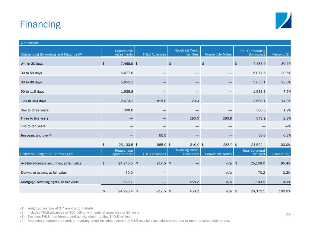 Financing $ in millions Repurchase Revolving Credit Total Outstanding Outstanding Borrowings and Maturities(1) Agreements FHLB Advances Facilities Convertible Notes Borrowings Percent (%) Within 30 days $ 7,488.9 $ — $ — $ — $ 7,488.9 30.5% 30 to 59 days 5,077.6 — — — 5,077.6 20.6% 60 to 89 days 5,655.1 — — — 5,655.1 23.0% 90 to 119 days 1,938.8 — — — 1,938.8 7.9% 120 to 364 days 2,673.1 815.0 20.0 — 3,508.1 14.3% One to three years 300.0 — — — 300.0 1.2% Three to five years — — 290.0 283.9 573.9 2.3% Five to ten years — — — — — —% Ten years and over(2) — 50.0 — — 50.0 0.2% $ 23,133.5 $ 865.0 $ 310.0 $ 283.9 $ 24,592.4 100.0% Repurchase Revolving Credit Total Collateral Collateral Pledged for Borrowings(3) Agreements(4) FHLB Advances Facilities(4) Convertible Notes Pledged Percent (%) Available-for-sale securities, at fair value $ 24,240.5 $ 917.5 $ — n/a $ 25,158.0 95.4% Derivative assets, at fair value 70.2 — — n/a 70.2 0.3% Mortgage servicing rights, at fair value 685.7 — 458.2 n/a 1,143.9 4.3% $ 24,996.4 $ 917.5 $ 458.2 n/a $ 26,372.1 100.0% (1) Weighted average of 3.7 months to maturity. (2) Includes FHLB advances of $50 million with original maturities of 20 years. (3) Excludes FHLB membership and activity stock totaling $40.8 million. 26 (4) Repurchase agreements and/or revolving credit facilities secured by MSR may be over-collateralized due to operational considerations.