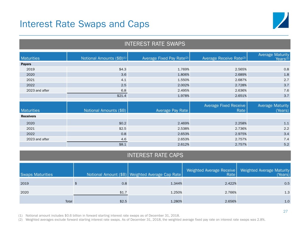 Interest Rate Swaps and Caps INTEREST RATE SWAPS Average Maturity Maturities Notional Amounts ($B)(1) Average Fixed Pay Rate(2) Average Receive Rate(2) Years(2) Payers 2019 $4.3 1.769% 2.565% 0.8 2020 3.6 1.806% 2.689% 1.8 2021 4.1 1.550% 2.687% 2.7 2022 2.5 2.002% 2.728% 3.7 2023 and after 6.8 2.495% 2.636% 7.6 $21.4 1.978% 2.651% 3.7 Average Fixed Receive Average Maturity Maturities Notional Amounts ($B) Average Pay Rate Rate (Years) Receivers 2020 $0.2 2.469% 2.258% 1.1 2021 $2.5 2.538% 2.736% 2.2 2022 0.8 2.653% 2.975% 3.4 2023 and after 4.6 2.653% 2.757% 7.4 $8.1 2.612% 2.757% 5.2 INTEREST RATE CAPS Weighted Average Receive Weighted Average Maturity Swaps Maturities Notional Amount ($B) Weighted Average Cap Rate Rate (Years) 2019 $ 0.8 1.344% 2.422% 0.5 2020 $1.7 1.250% 2.766% 1.3 Total $2.5 1.280% 2.656% 1.0 27 (1) Notional amount includes $0.6 billion in forward starting interest rate swaps as of December 31, 2018. (2) Weighted averages exclude forward starting interest rate swaps. As of December 31, 2018, the weighted average fixed pay rate on interest rate swaps was 2.8%.