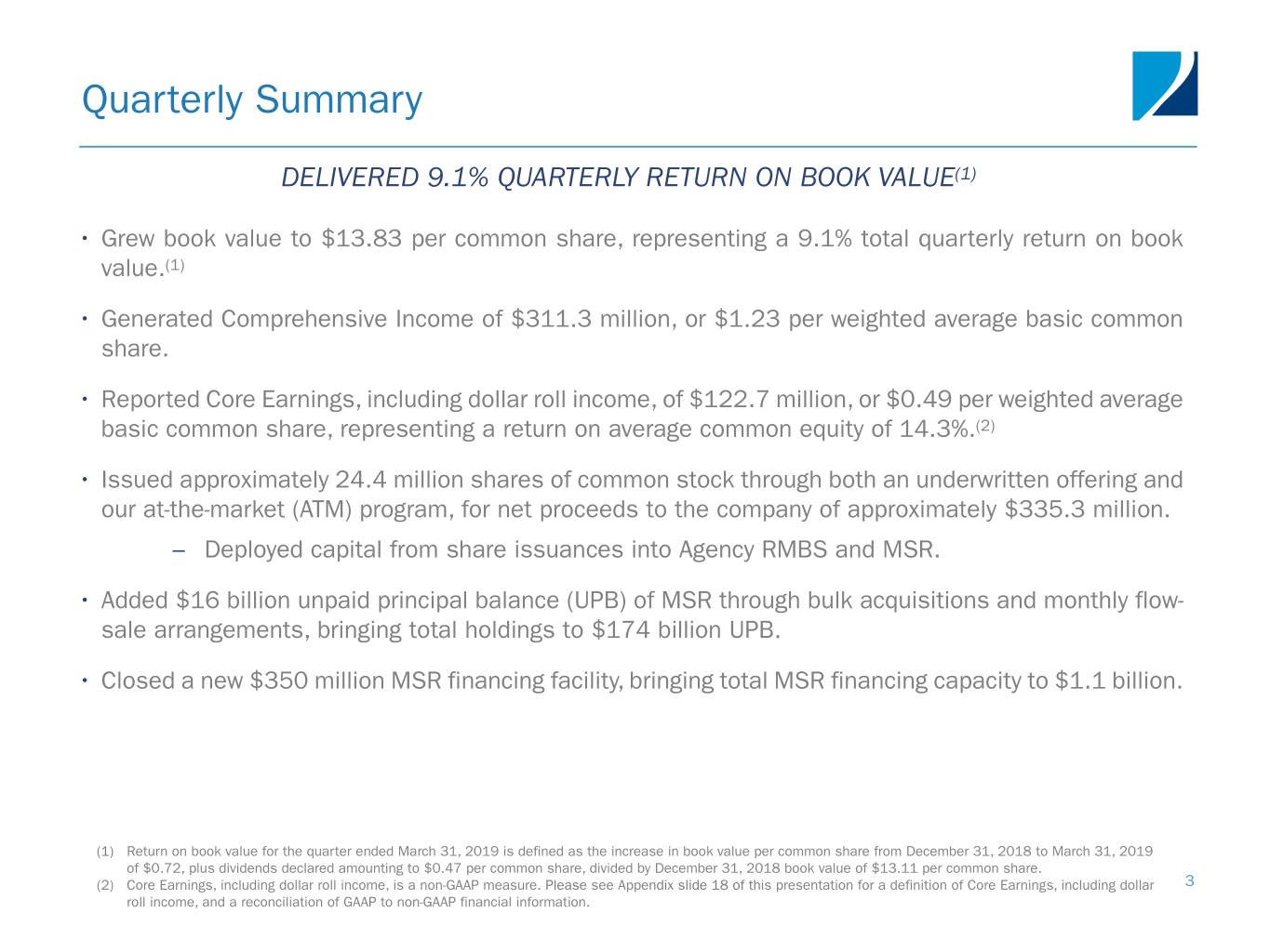 Quarterly Summary DELIVERED 9.1% QUARTERLY RETURN ON BOOK VALUE(1) • Grew book value to $13.83 per common share, representing a 9.1% total quarterly return on book value.(1) • Generated Comprehensive Income of $311.3 million, or $1.23 per weighted average basic common share. • Reported Core Earnings, including dollar roll income, of $122.7 million, or $0.49 per weighted average basic common share, representing a return on average common equity of 14.3%.(2) • Issued approximately 24.4 million shares of common stock through both an underwritten offering and our at-the-market (ATM) program, for net proceeds to the company of approximately $335.3 million. – Deployed capital from share issuances into Agency RMBS and MSR. • Added $16 billion unpaid principal balance (UPB) of MSR through bulk acquisitions and monthly flow- sale arrangements, bringing total holdings to $174 billion UPB. • Closed a new $350 million MSR financing facility, bringing total MSR financing capacity to $1.1 billion. (1) Return on book value for the quarter ended March 31, 2019 is defined as the increase in book value per common share from December 31, 2018 to March 31, 2019 of $0.72, plus dividends declared amounting to $0.47 per common share, divided by December 31, 2018 book value of $13.11 per common share. (2) Core Earnings, including dollar roll income, is a non-GAAP measure. Please see Appendix slide 18 of this presentation for a definition of Core Earnings, including dollar 3 roll income, and a reconciliation of GAAP to non-GAAP financial information.