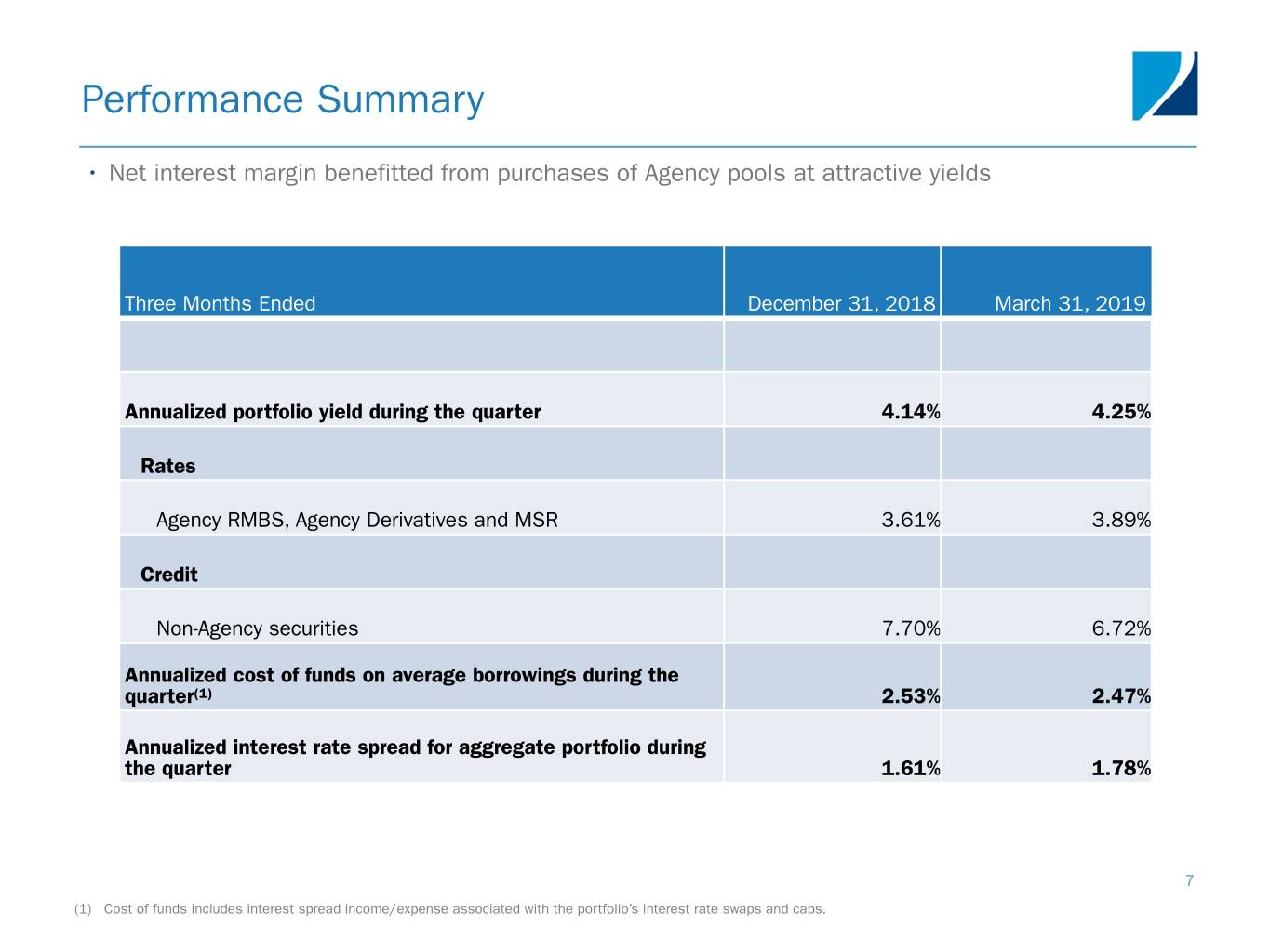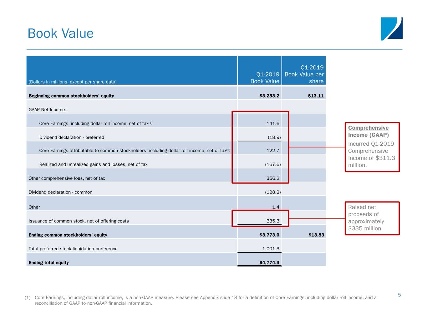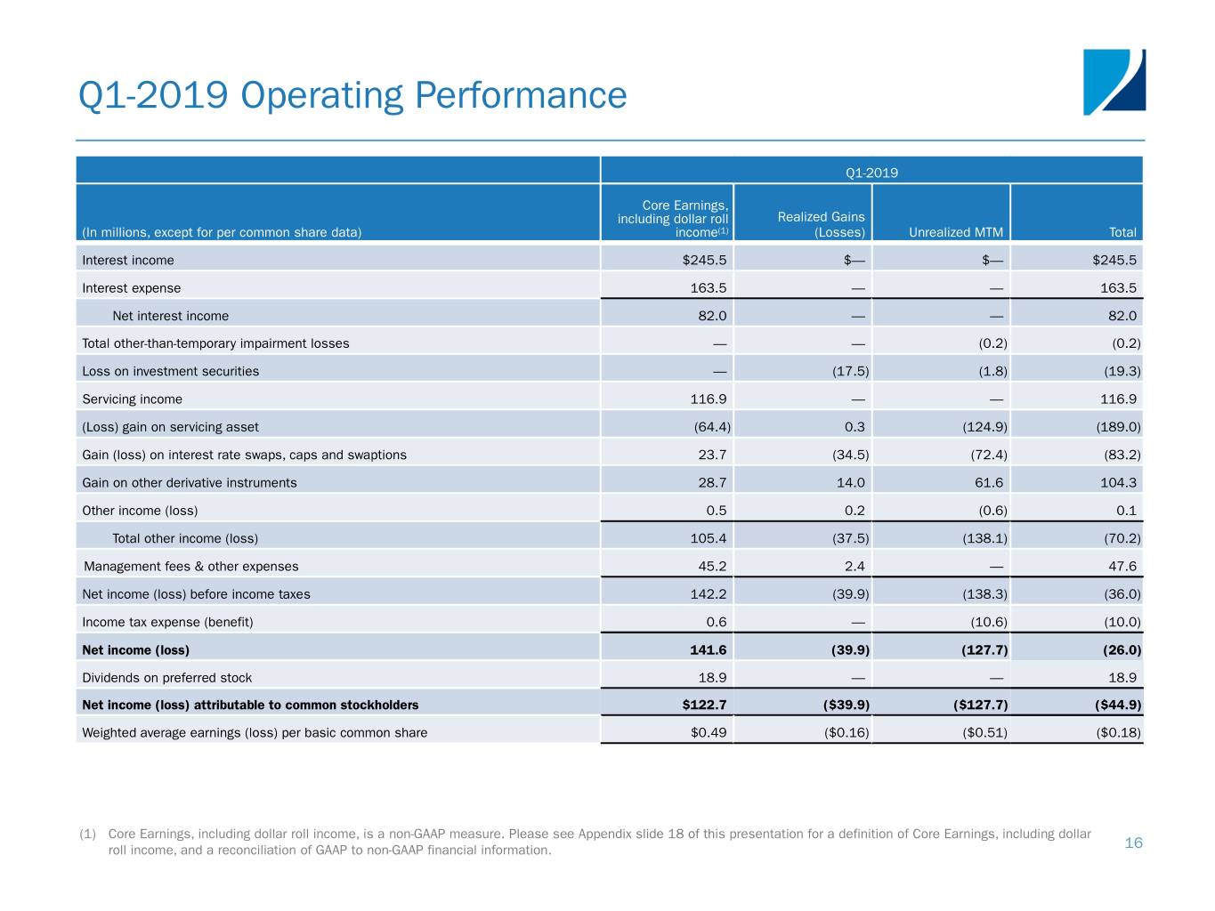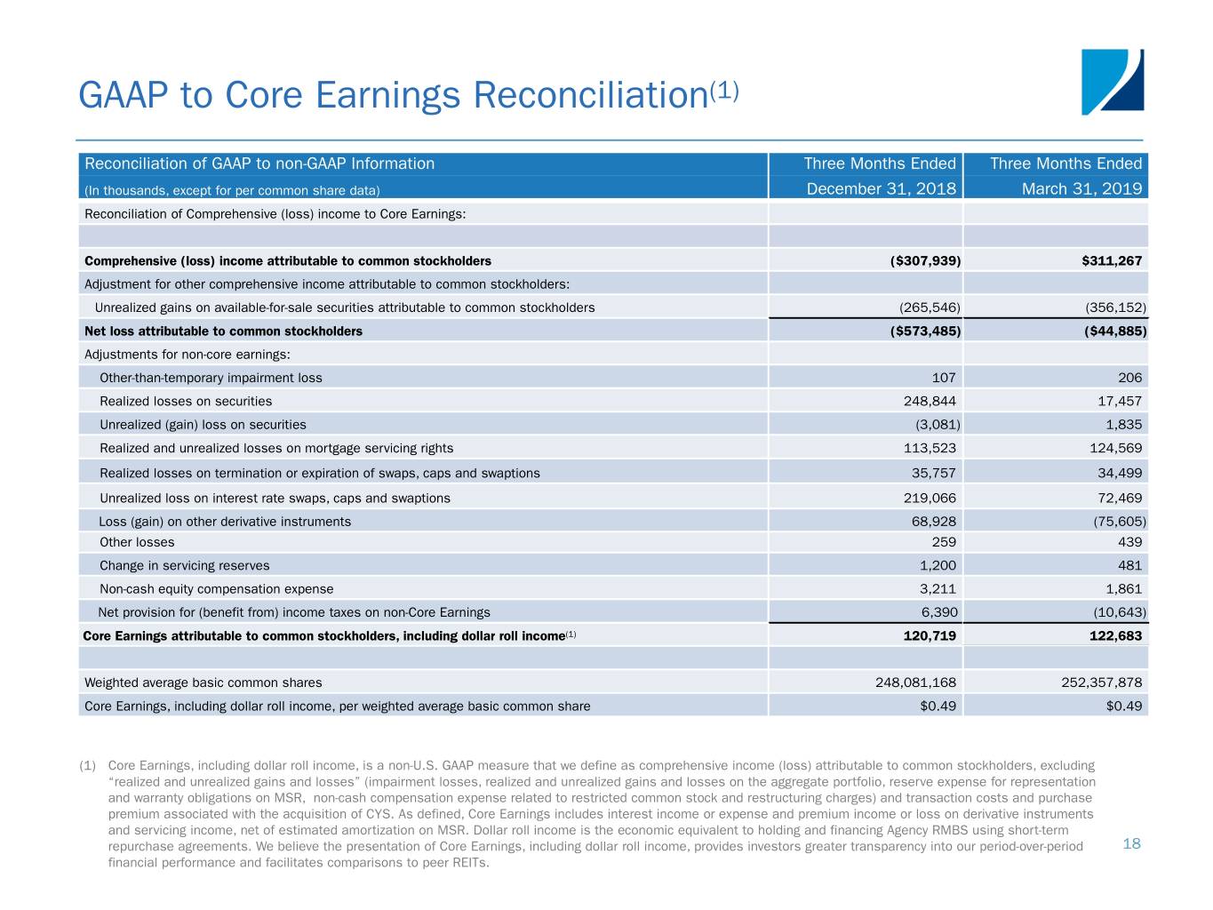 GAAP to Core Earnings Reconciliation(1) Reconciliation of GAAP to non-GAAP Information Three Months Ended Three Months Ended (In thousands, except for per common share data) December 31, 2018 March 31, 2019 Reconciliation of Comprehensive (loss) income to Core Earnings: Comprehensive (loss) income attributable to common stockholders ($307,939) $311,267 Adjustment for other comprehensive income attributable to common stockholders: Unrealized gains on available-for-sale securities attributable to common stockholders (265,546) (356,152) Net loss attributable to common stockholders ($573,485) ($44,885) Adjustments for non-core earnings: Other-than-temporary impairment loss 107 206 Realized losses on securities 248,844 17,457 Unrealized (gain) loss on securities (3,081) 1,835 Realized and unrealized losses on mortgage servicing rights 113,523 124,569 Realized losses on termination or expiration of swaps, caps and swaptions 35,757 34,499 Unrealized loss on interest rate swaps, caps and swaptions 219,066 72,469 Loss (gain) on other derivative instruments 68,928 (75,605) Other losses 259 439 Change in servicing reserves 1,200 481 Non-cash equity compensation expense 3,211 1,861 Net provision for (benefit from) income taxes on non-Core Earnings 6,390 (10,643) Core Earnings attributable to common stockholders, including dollar roll income(1) 120,719 122,683 Weighted average basic common shares 248,081,168 252,357,878 Core Earnings, including dollar roll income, per weighted average basic common share $0.49 $0.49 (1) Core Earnings, including dollar roll income, is a non-U.S. GAAP measure that we define as comprehensive income (loss) attributable to common stockholders, excluding “realized and unrealized gains and losses” (impairment losses, realized and unrealized gains and losses on the aggregate portfolio, reserve expense for representation and warranty obligations on MSR, non-cash compensation expense related to restricted common stock and restructuring charges) and transaction costs and purchase premium associated with the acquisition of CYS. As defined, Core Earnings includes interest income or expense and premium income or loss on derivative instruments and servicing income, net of estimated amortization on MSR. Dollar roll income is the economic equivalent to holding and financing Agency RMBS using short-term repurchase agreements. We believe the presentation of Core Earnings, including dollar roll income, provides investors greater transparency into our period-over-period 18 financial performance and facilitates comparisons to peer REITs.