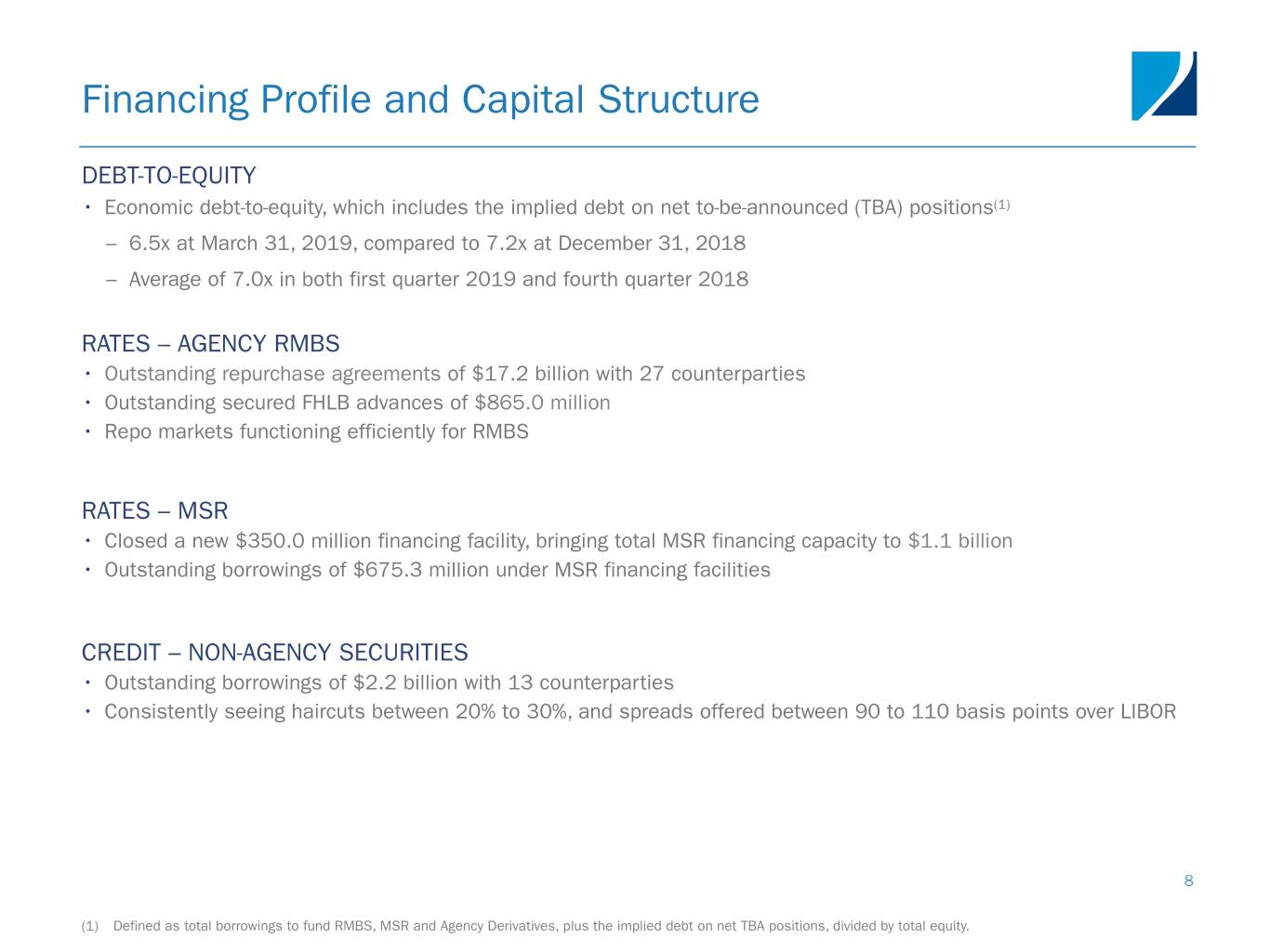 Performance Summary • Net interest margin benefitted from purchases of Agency pools at attractive yields Three Months Ended December 31, 2018 March 31, 2019 Annualized portfolio yield during the quarter 4.14% 4.25% Rates Agency RMBS, Agency Derivatives and MSR 3.61% 3.89% Credit Non-Agency securities 7.70% 6.72% Annualized cost of funds on average borrowings during the quarter(1) 2.53% 2.47% Annualized interest rate spread for aggregate portfolio during the quarter 1.61% 1.78% 7 (1) Cost of funds includes interest spread income/expense associated with the portfolio’s interest rate swaps and caps.