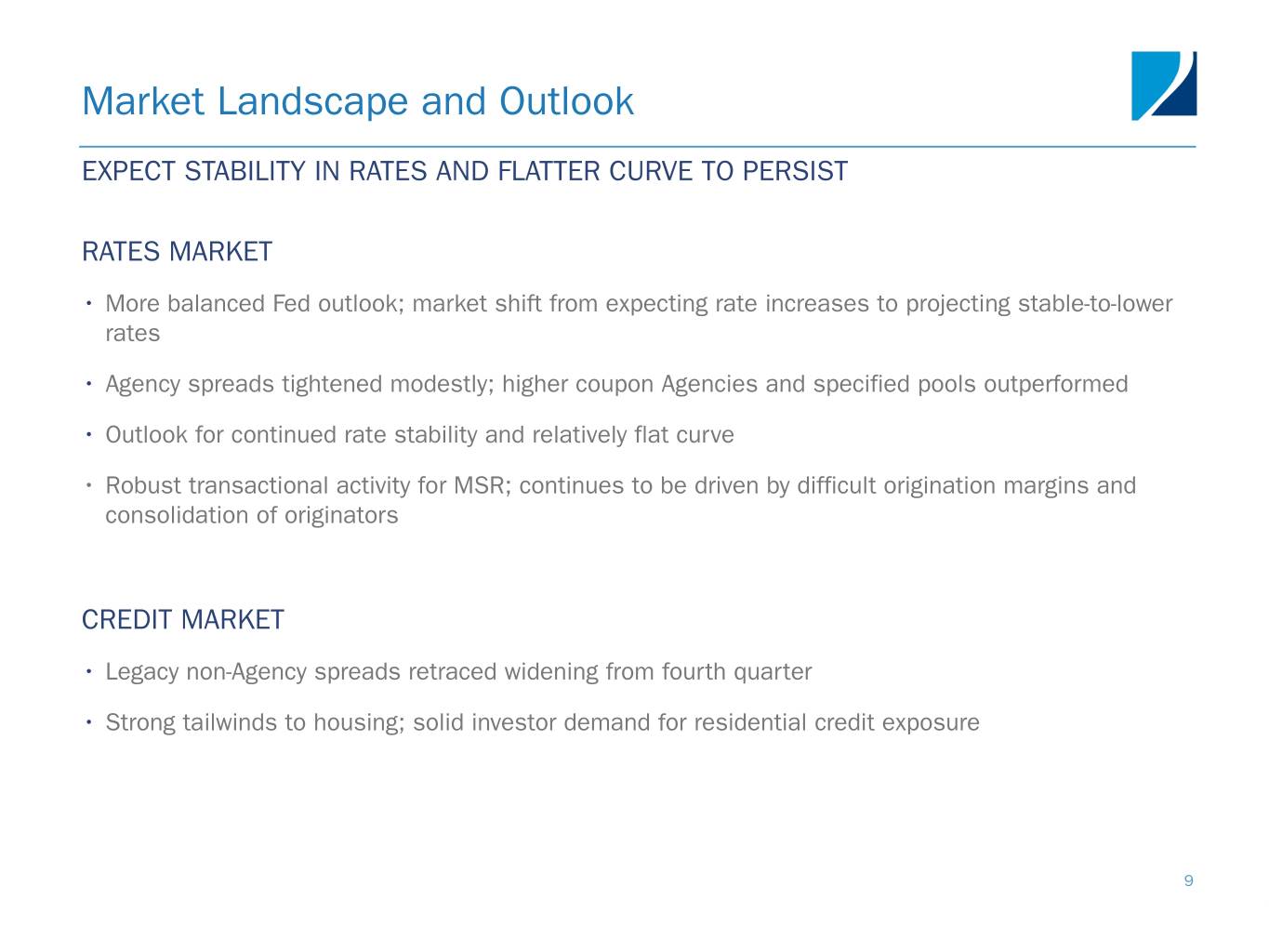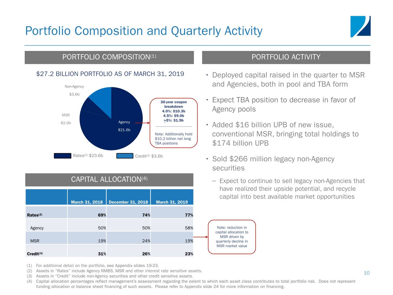 Market Landscape and Outlook EXPECT STABILITY IN RATES AND FLATTER CURVE TO PERSIST RATES MARKET • More balanced Fed outlook; market shift from expecting rate increases to projecting stable-to-lower rates • Agency spreads tightened modestly; higher coupon Agencies and specified pools outperformed • Outlook for continued rate stability and relatively flat curve • Robust transactional activity for MSR; continues to be driven by difficult origination margins and consolidation of originators CREDIT MARKET • Legacy non-Agency spreads retraced widening from fourth quarter • Strong tailwinds to housing; solid investor demand for residential credit exposure 9
