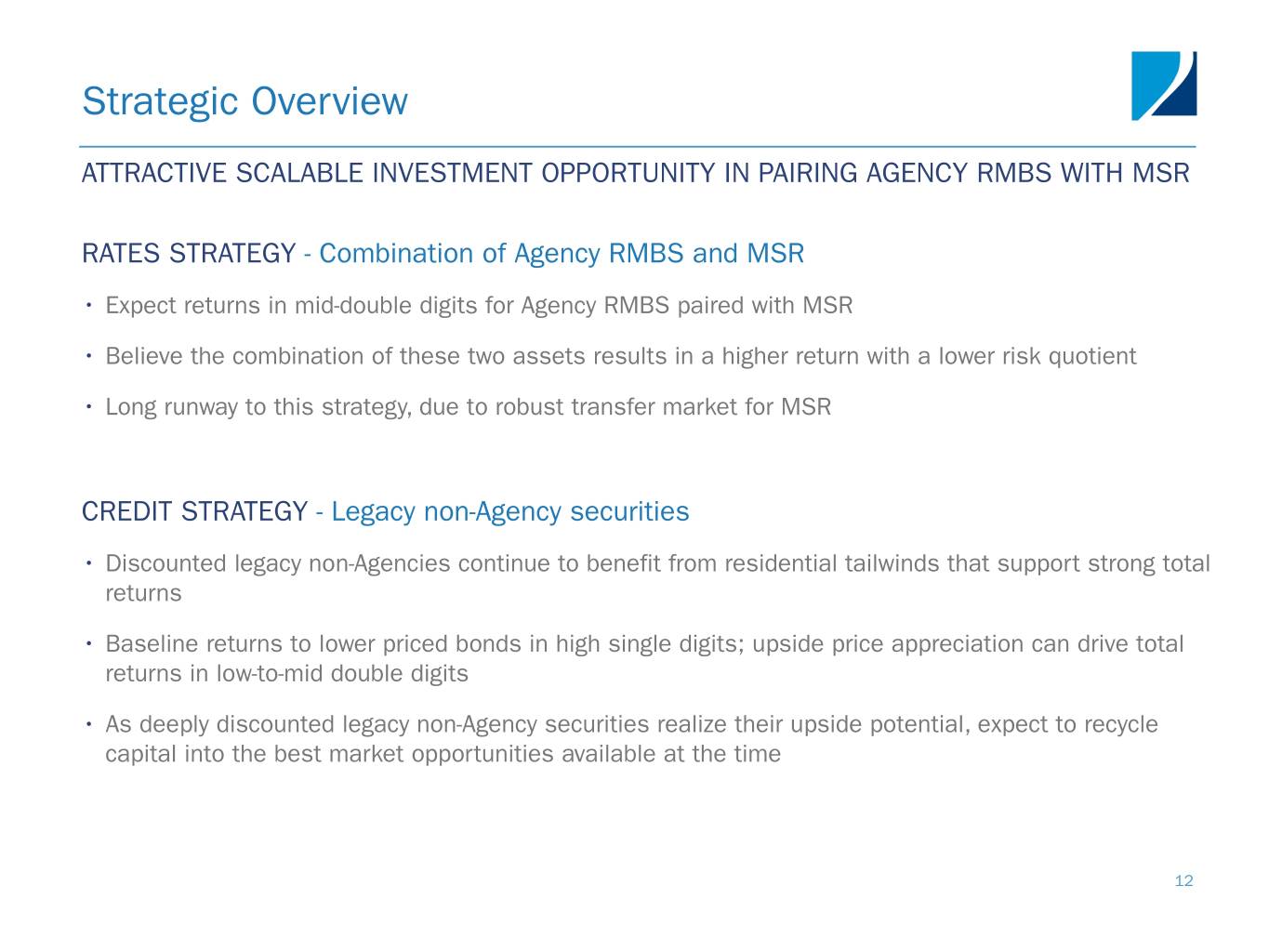 Strategic Overview ATTRACTIVE SCALABLE INVESTMENT OPPORTUNITY IN PAIRING AGENCY RMBS WITH MSR RATES STRATEGY - Combination of Agency RMBS and MSR • Expect returns in mid-double digits for Agency RMBS paired with MSR • Believe the combination of these two assets results in a higher return with a lower risk quotient • Long runway to this strategy, due to robust transfer market for MSR CREDIT STRATEGY - Legacy non-Agency securities • Discounted legacy non-Agencies continue to benefit from residential tailwinds that support strong total returns • Baseline returns to lower priced bonds in high single digits; upside price appreciation can drive total returns in low-to-mid double digits • As deeply discounted legacy non-Agency securities realize their upside potential, expect to recycle capital into the best market opportunities available at the time 12