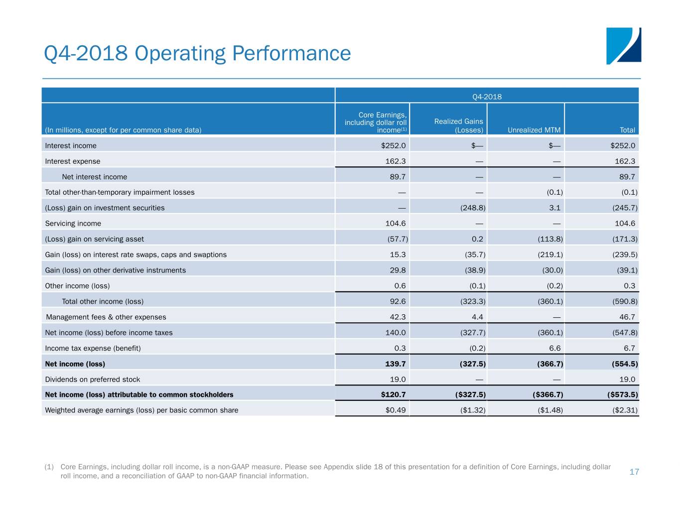 Q1-2019 Operating Performance Q1-2019 Core Earnings, including dollar roll Realized Gains (In millions, except for per common share data) income(1) (Losses) Unrealized MTM Total Interest income $245.5 $— $— $245.5 Interest expense 163.5 — — 163.5 Net interest income 82.0 — — 82.0 Total other-than-temporary impairment losses — — (0.2) (0.2) Loss on investment securities — (17.5) (1.8) (19.3) Servicing income 116.9 — — 116.9 (Loss) gain on servicing asset (64.4) 0.3 (124.9) (189.0) Gain (loss) on interest rate swaps, caps and swaptions 23.7 (34.5) (72.4) (83.2) Gain on other derivative instruments 28.7 14.0 61.6 104.3 Other income (loss) 0.5 0.2 (0.6) 0.1 Total other income (loss) 105.4 (37.5) (138.1) (70.2) Management fees & other expenses 45.2 2.4 — 47.6 Net income (loss) before income taxes 142.2 (39.9) (138.3) (36.0) Income tax expense (benefit) 0.6 — (10.6) (10.0) Net income (loss) 141.6 (39.9) (127.7) (26.0) Dividends on preferred stock 18.9 — — 18.9 Net income (loss) attributable to common stockholders $122.7 ($39.9) ($127.7) ($44.9) Weighted average earnings (loss) per basic common share $0.49 ($0.16) ($0.51) ($0.18) (1) Core Earnings, including dollar roll income, is a non-GAAP measure. Please see Appendix slide 18 of this presentation for a definition of Core Earnings, including dollar roll income, and a reconciliation of GAAP to non-GAAP financial information. 16