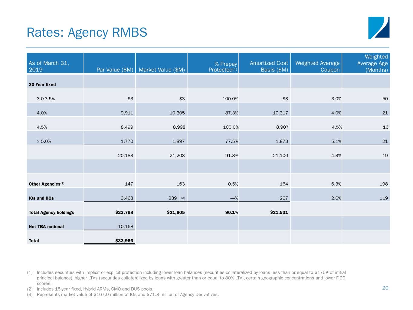 Rates: Agency RMBS Weighted As of March 31, % Prepay Amortized Cost Weighted Average Average Age 2019 Par Value ($M) Market Value ($M) Protected(1) Basis ($M) Coupon (Months) 30-Year fixed 3.0-3.5% $3 $3 100.0% $3 3.0% 50 4.0% 9,911 10,305 87.3% 10,317 4.0% 21 4.5% 8,499 8,998 100.0% 8,907 4.5% 16 ≥ 5.0% 1,770 1,897 77.5% 1,873 5.1% 21 20,183 21,203 91.8% 21,100 4.3% 19 Other Agencies(2) 147 163 0.5% 164 6.3% 198 IOs and IIOs 3,468 239 (3) —% 267 2.6% 119 Total Agency holdings $23,798 $21,605 90.1% $21,531 Net TBA notional 10,168 Total $33,966 (1) Includes securities with implicit or explicit protection including lower loan balances (securities collateralized by loans less than or equal to $175K of initial principal balance), higher LTVs (securities collateralized by loans with greater than or equal to 80% LTV), certain geographic concentrations and lower FICO scores. (2) Includes 15-year fixed, Hybrid ARMs, CMO and DUS pools. 20 (3) Represents market value of $167.0 million of IOs and $71.8 million of Agency Derivatives.
