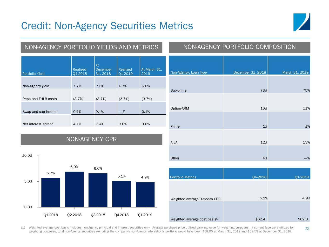 Credit: Non-Agency Securities Metrics NON-AGENCY PORTFOLIO YIELDS AND METRICS NON-AGENCY PORTFOLIO COMPOSITION At Realized December Realized At March 31, Portfolio Yield Q4-2018 31, 2018 Q1-2019 2019 Non-Agency: Loan Type December 31, 2018 March 31, 2019 Non-Agency yield 7.7% 7.0% 6.7% 6.6% Sub-prime 73% 75% Repo and FHLB costs (3.7%) (3.7%) (3.7%) (3.7%) Option-ARM 10% 11% Swap and cap income 0.1% 0.1% —% 0.1% Net interest spread 4.1% 3.4% 3.0% 3.0% Prime 1% 1% NON-AGENCY CPR Alt-A 12% 13% 10.0% Other 4% —% 6.9% 6.6% 5.7% 5.1% 4.9% Portfolio Metrics Q4-2018 Q1-2019 5.0% Weighted average 3-month CPR 5.1% 4.9% 0.0% Q1-2018 Q2-2018 Q3-2018 Q4-2018 Q1-2019 Weighted average cost basis(1) $62.4 $62.0 (1) Weighted average cost basis includes non-Agency principal and interest securities only. Average purchase price utilized carrying value for weighting purposes. If current face were utilized for 22 weighting purposes, total non-Agency securities excluding the company’s non-Agency interest-only portfolio would have been $58.95 at March 31, 2019 and $59.59 at December 31, 2018.