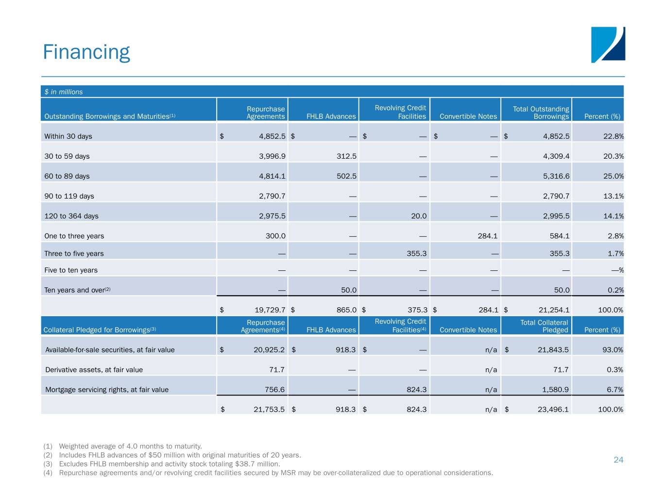 Financing $ in millions Repurchase Revolving Credit Total Outstanding Outstanding Borrowings and Maturities(1) Agreements FHLB Advances Facilities Convertible Notes Borrowings Percent (%) Within 30 days $ 4,852.5 $ — $ — $ — $ 4,852.5 22.8% 30 to 59 days 3,996.9 312.5 — — 4,309.4 20.3% 60 to 89 days 4,814.1 502.5 — — 5,316.6 25.0% 90 to 119 days 2,790.7 — — — 2,790.7 13.1% 120 to 364 days 2,975.5 — 20.0 — 2,995.5 14.1% One to three years 300.0 — — 284.1 584.1 2.8% Three to five years — — 355.3 — 355.3 1.7% Five to ten years — — — — — —% Ten years and over(2) — 50.0 — — 50.0 0.2% $ 19,729.7 $ 865.0 $ 375.3 $ 284.1 $ 21,254.1 100.0% Repurchase Revolving Credit Total Collateral Collateral Pledged for Borrowings(3) Agreements(4) FHLB Advances Facilities(4) Convertible Notes Pledged Percent (%) Available-for-sale securities, at fair value $ 20,925.2 $ 918.3 $ — n/a $ 21,843.5 93.0% Derivative assets, at fair value 71.7 — — n/a 71.7 0.3% Mortgage servicing rights, at fair value 756.6 — 824.3 n/a 1,580.9 6.7% $ 21,753.5 $ 918.3 $ 824.3 n/a $ 23,496.1 100.0% (1) Weighted average of 4.0 months to maturity. (2) Includes FHLB advances of $50 million with original maturities of 20 years. (3) Excludes FHLB membership and activity stock totaling $38.7 million. 24 (4) Repurchase agreements and/or revolving credit facilities secured by MSR may be over-collateralized due to operational considerations.