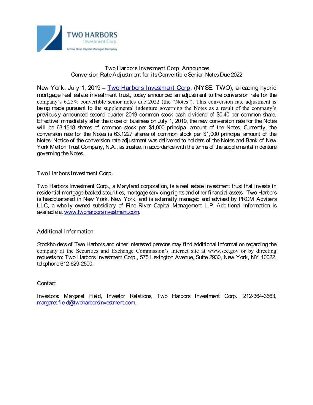Two Harbors Investment Corp. Announces Conversion Rate Adjustment for its Convertible Senior Notes Due 2022 New York, July 1, 2019 – Two Harbors Investment Corp. (NYSE: TWO), a leading hybrid mortgage real estate investment trust, today announced an adjustment to the conversion rate for the company’s 6.25% convertible senior notes due 2022 (the “Notes”). This conversion rate adjustment is being made pursuant to the supplemental indenture governing the Notes as a result of the company’s previously announced second quarter 2019 common stock cash dividend of $0.40 per common share. Effective immediately after the close of business on July 1, 2019, the new conversion rate for the Notes will be 63.1518 shares of common stock per $1,000 principal amount of the Notes. Currently, the conversion rate for the Notes is 63.1227 shares of common stock per $1,000 principal amount of the Notes. Notice of the conversion rate adjustment was delivered to holders of the Notes and Bank of New York Mellon Trust Company, N.A., as trustee, in accordance with the terms of the supplemental indenture governing the Notes. Two Harbors Investment Corp. Two Harbors Investment Corp., a Maryland corporation, is a real estate investment trust that invests in residential mortgage-backed securities, mortgage servicing rights and other financial assets. Two Harbors is headquartered in New York, New York, and is externally managed and advised by PRCM Advisers LLC, a wholly owned subsidiary of Pine River Capital Management L.P. Additional information is available at www.twoharborsinvestment.com. Additional Information Stockholders of Two Harbors and other interested persons may find additional information regarding the company at the Securities and Exchange Commission’s Internet site at www.sec.gov or by directing requests to: Two Harbors Investment Corp., 575 Lexington Avenue, Suite 2930, New York, NY 10022, telephone 612-629-2500. Contact Investors: Margaret Field, Investor Relations, Two Harbors Investment Corp., 212-364-3663, margaret.field@twoharborsinvestment.com.
