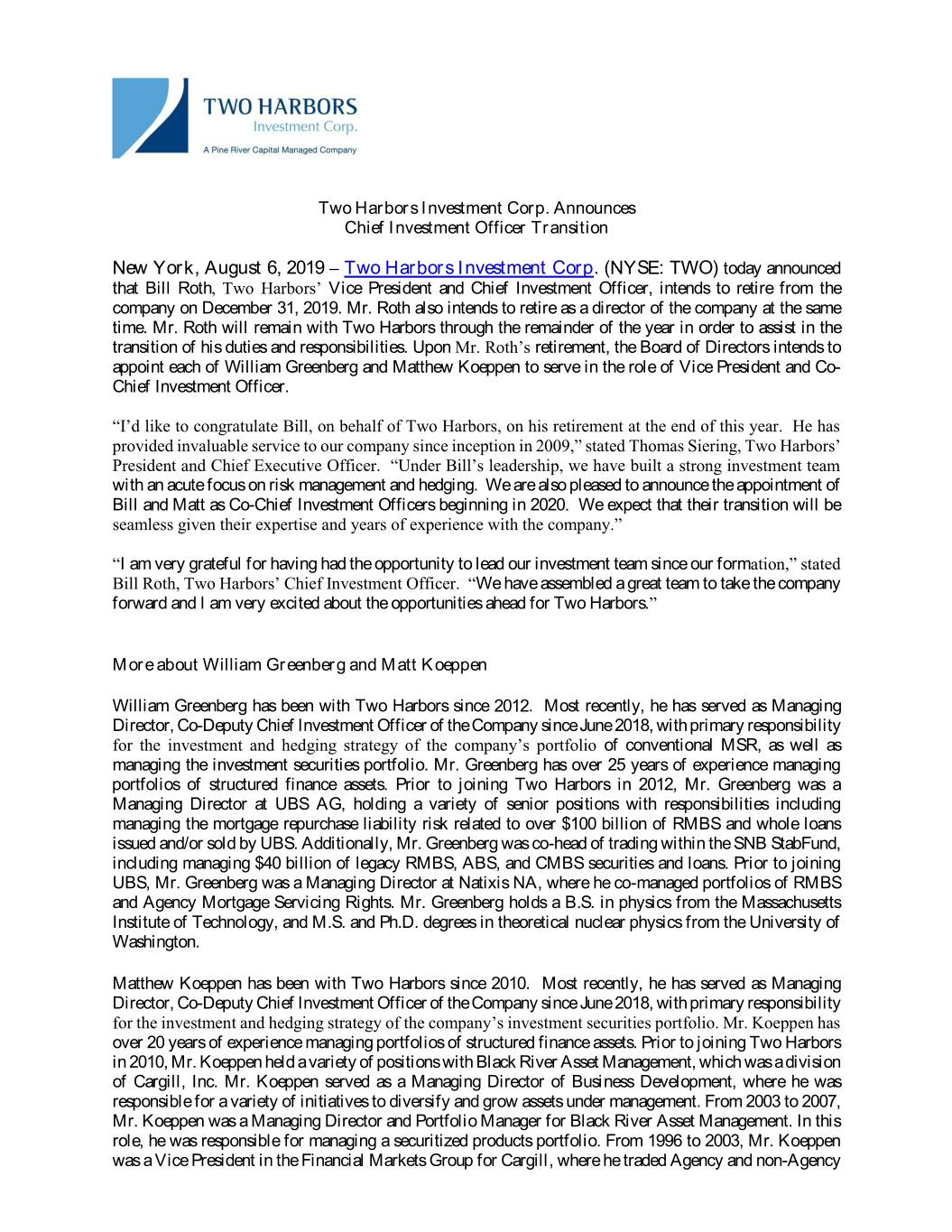 Two Harbors Investment Corp. Announces Chief Investment Officer Transition New York, August 6, 2019 – Two Harbors Investment Corp. (NYSE: TWO) today announced that Bill Roth, Two Harbors’ Vice President and Chief Investment Officer, intends to retire from the company on December 31, 2019. Mr. Roth also intends to retire as a director of the company at the same time. Mr. Roth will remain with Two Harbors through the remainder of the year in order to assist in the transition of his duties and responsibilities. Upon Mr. Roth’s retirement, the Board of Directors intends to appoint each of William Greenberg and Matthew Koeppen to serve in the role of Vice President and Co- Chief Investment Officer. “I’d like to congratulate Bill, on behalf of Two Harbors, on his retirement at the end of this year. He has provided invaluable service to our company since inception in 2009,” stated Thomas Siering, Two Harbors’ President and Chief Executive Officer. “Under Bill’s leadership, we have built a strong investment team with an acute focus on risk management and hedging. We are also pleased to announce the appointment of Bill and Matt as Co-Chief Investment Officers beginning in 2020. We expect that their transition will be seamless given their expertise and years of experience with the company.” “I am very grateful for having had the opportunity to lead our investment team since our formation,” stated Bill Roth, Two Harbors’ Chief Investment Officer. “We have assembled a great team to take the company forward and I am very excited about the opportunities ahead for Two Harbors.” More about William Greenberg and Matt Koeppen William Greenberg has been with Two Harbors since 2012. Most recently, he has served as Managing Director, Co-Deputy Chief Investment Officer of the Company since June 2018, with primary responsibility for the investment and hedging strategy of the company’s portfolio of conventional MSR, as well as managing the investment securities portfolio. Mr. Greenberg has over 25 years of experience managing portfolios of structured finance assets. Prior to joining Two Harbors in 2012, Mr. Greenberg was a Managing Director at UBS AG, holding a variety of senior positions with responsibilities including managing the mortgage repurchase liability risk related to over $100 billion of RMBS and whole loans issued and/or sold by UBS. Additionally, Mr. Greenberg was co-head of trading within the SNB StabFund, including managing $40 billion of legacy RMBS, ABS, and CMBS securities and loans. Prior to joining UBS, Mr. Greenberg was a Managing Director at Natixis NA, where he co-managed portfolios of RMBS and Agency Mortgage Servicing Rights. Mr. Greenberg holds a B.S. in physics from the Massachusetts Institute of Technology, and M.S. and Ph.D. degrees in theoretical nuclear physics from the University of Washington. Matthew Koeppen has been with Two Harbors since 2010. Most recently, he has served as Managing Director, Co-Deputy Chief Investment Officer of the Company since June 2018, with primary responsibility for the investment and hedging strategy of the company’s investment securities portfolio. Mr. Koeppen has over 20 years of experience managing portfolios of structured finance assets. Prior to joining Two Harbors in 2010, Mr. Koeppen held a variety of positions with Black River Asset Management, which was a division of Cargill, Inc. Mr. Koeppen served as a Managing Director of Business Development, where he was responsible for a variety of initiatives to diversify and grow assets under management. From 2003 to 2007, Mr. Koeppen was a Managing Director and Portfolio Manager for Black River Asset Management. In this role, he was responsible for managing a securitized products portfolio. From 1996 to 2003, Mr. Koeppen was a Vice President in the Financial Markets Group for Cargill, where he traded Agency and non-Agency