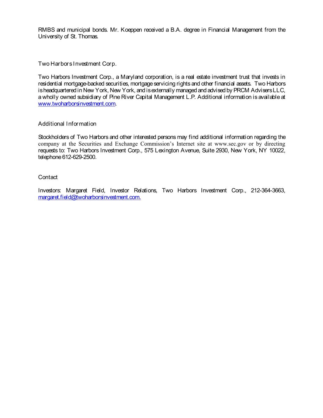 RMBS and municipal bonds. Mr. Koeppen received a B.A. degree in Financial Management from the University of St. Thomas. Two Harbors Investment Corp. Two Harbors Investment Corp., a Maryland corporation, is a real estate investment trust that invests in residential mortgage-backed securities, mortgage servicing rights and other financial assets. Two Harbors is headquartered in New York, New York, and is externally managed and advised by PRCM Advisers LLC, a wholly owned subsidiary of Pine River Capital Management L.P. Additional information is available at www.twoharborsinvestment.com. Additional Information Stockholders of Two Harbors and other interested persons may find additional information regarding the company at the Securities and Exchange Commission’s Internet site at www.sec.gov or by directing requests to: Two Harbors Investment Corp., 575 Lexington Avenue, Suite 2930, New York, NY 10022, telephone 612-629-2500. Contact Investors: Margaret Field, Investor Relations, Two Harbors Investment Corp., 212-364-3663, margaret.field@twoharborsinvestment.com.