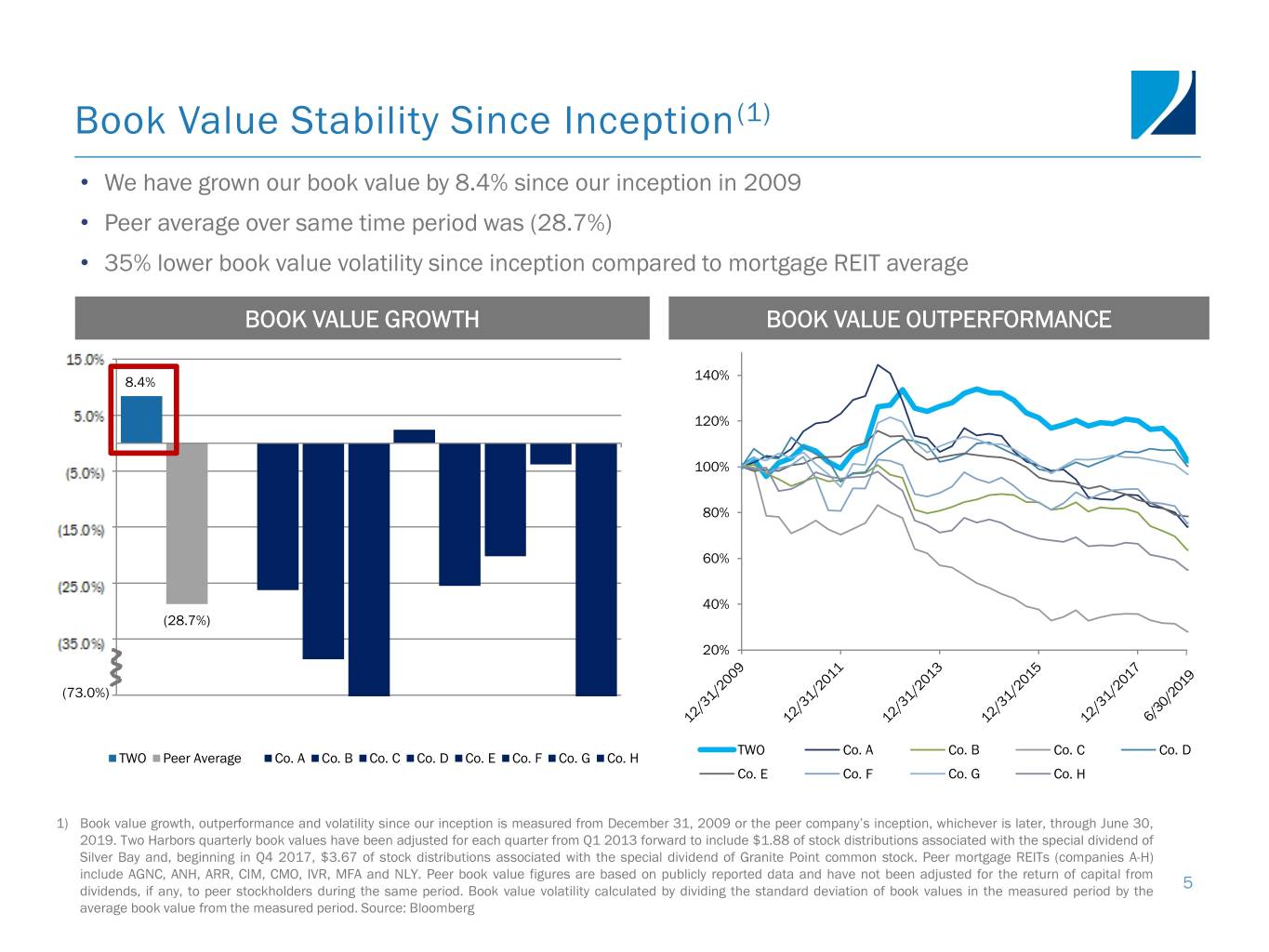 Substantial Total Stockholder Return Outperformance • Outperformed peer group by over 45% since our inception • Delivered total stockholder return of 191% during that time(1) ― Bloomberg REIT Mortgage Index total stockholder return of 146% over the same period of time(2) 220.0% 191% 190.0% 160.0% 146% 130.0% 100.0% 70.0% 40.0% 10.0% -20.0% (1) TWO BBG REIT MTG Index(2) 1) Two Harbors’ total stockholder return is calculated for the period October 29, 2009 through June 30, 2019. Total stockholder return is defined as stock price appreciation including dividends. Source: Bloomberg. 4 2) Bloomberg REIT Mortgage Index total stockholder return for the period October 29, 2009 through June 30, 2019. The Bloomberg REIT Mortgage Index tracks publicly traded REITs whose principal business consists of originating, servicing or investing in residential mortgage interests. The index uses a modified market capitalization weighted methodology, and components are reviewed quarterly for eligibility. Source: Bloomberg.