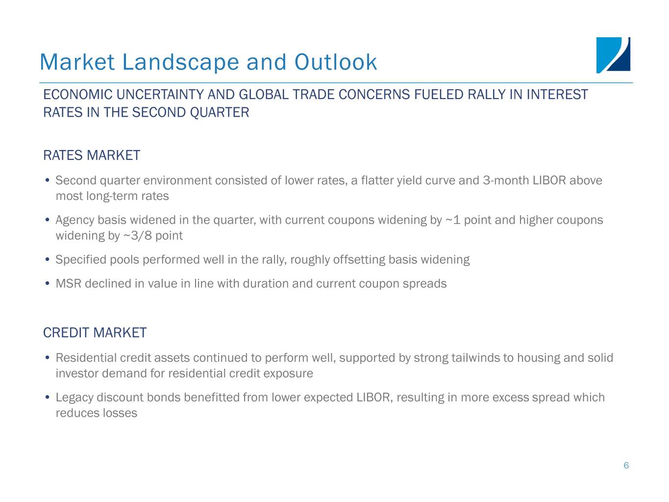 Market Landscape and Outlook ECONOMIC UNCERTAINTY AND GLOBAL TRADE CONCERNS FUELED RALLY IN INTEREST RATES IN THE SECOND QUARTER RATES MARKET • Second quarter environment consisted of lower rates, a flatter yield curve and 3-month LIBOR above most long-term rates • Agency basis widened in the quarter, with current coupons widening by ~1 point and higher coupons widening by ~3/8 point • Specified pools performed well in the rally, roughly offsetting basis widening • MSR declined in value in line with duration and current coupon spreads CREDIT MARKET • Residential credit assets continued to perform well, supported by strong tailwinds to housing and solid investor demand for residential credit exposure • Legacy discount bonds benefitted from lower expected LIBOR, resulting in more excess spread which reduces losses 6