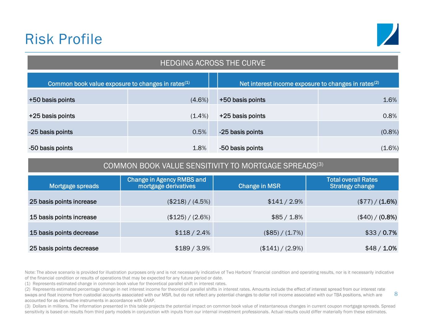 Risk Profile HEDGING ACROSS THE CURVE Common book value exposure to changes in rates(1) Net interest income exposure to changes in rates(2) +50 basis points (4.6%) +50 basis points 1.6% +25 basis points (1.4%) +25 basis points 0.8% -25 basis points 0.5% -25 basis points (0.8%) -50 basis points 1.8% -50 basis points (1.6%) COMMON BOOK VALUE SENSITIVITY TO MORTGAGE SPREADS(3) Change in Agency RMBS and Total overall Rates Mortgage spreads mortgage derivatives Change in MSR Strategy change 25 basis points increase ($218) / (4.5%) $141 / 2.9% ($77) / (1.6%) 15 basis points increase ($125) / (2.6%) $85 / 1.8% ($40) / (0.8%) 15 basis points decrease $118 / 2.4% ($85) / (1.7%) $33 / 0.7% 25 basis points decrease $189 / 3.9% ($141) / (2.9%) $48 / 1.0% Note: The above scenario is provided for illustration purposes only and is not necessarily indicative of Two Harbors’ financial condition and operating results, nor is it necessarily indicative of the financial condition or results of operations that may be expected for any future period or date. (1) Represents estimated change in common book value for theoretical parallel shift in interest rates. (2) Represents estimated percentage change in net interest income for theoretical parallel shifts in interest rates. Amounts include the effect of interest spread from our interest rate swaps and float income from custodial accounts associated with our MSR, but do not reflect any potential changes to dollar roll income associated with our TBA positions, which are 8 accounted for as derivative instruments in accordance with GAAP. (3) Dollars in millions. The information presented in this table projects the potential impact on common book value of instantaneous changes in current coupon mortgage spreads. Spread sensitivity is based on results from third party models in conjunction with inputs from our internal investment professionals. Actual results could differ materially from these estimates.