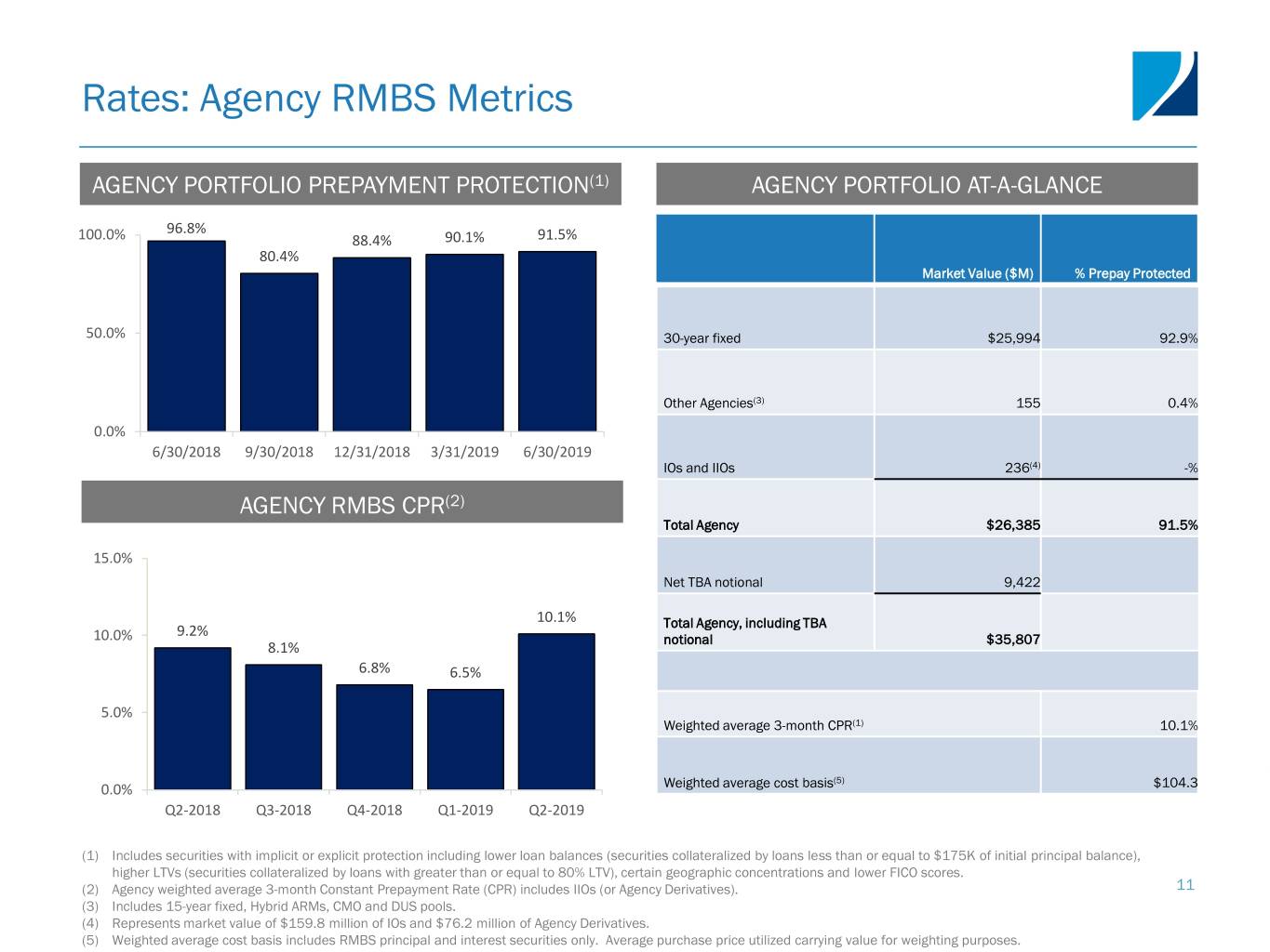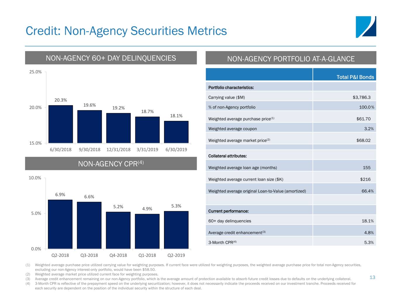 Credit: Non-Agency Securities Metrics NON-AGENCY 60+ DAY DELINQUENCIES NON-AGENCY PORTFOLIO AT-A-GLANCE 25.0% Total P&I Bonds Portfolio characteristics: Carrying value ($M) $3,786.3 20.3% 19.6% 20.0% 19.2% % of non-Agency portfolio 100.0% 18.7% 18.1% Weighted average purchase price(1) $61.70 Weighted average coupon 3.2% Weighted average market price(2) $68.02 15.0% 6/30/2018 9/30/2018 12/31/2018 3/31/2019 6/30/2019 Collateral attributes: (4) NON-AGENCY CPR Weighted average loan age (months) 155 10.0% Weighted average current loan size ($K) $216 Weighted average original Loan-to-Value (amortized) 66.4% 6.9% 6.6% 5.3% 5.2% 4.9% 5.0% Current performance: 60+ day delinquencies 18.1% Average credit enhancement(3) 4.8% 3-Month CPR(4) 5.3% 0.0% Q2-2018 Q3-2018 Q4-2018 Q1-2018 Q2-2019 (1) Weighted average purchase price utilized carrying value for weighting purposes. If current face were utilized for weighting purposes, the weighted average purchase price for total non-Agency securities, excluding our non-Agency interest-only portfolio, would have been $58.50. (2) Weighted average market price utilized current face for weighting purposes. (3) Average credit enhancement remaining on our non-Agency portfolio, which is the average amount of protection available to absorb future credit losses due to defaults on the underlying collateral. 13 (4) 3-Month CPR is reflective of the prepayment speed on the underlying securitization; however, it does not necessarily indicate the proceeds received on our investment tranche. Proceeds received for each security are dependent on the position of the individual security within the structure of each deal.