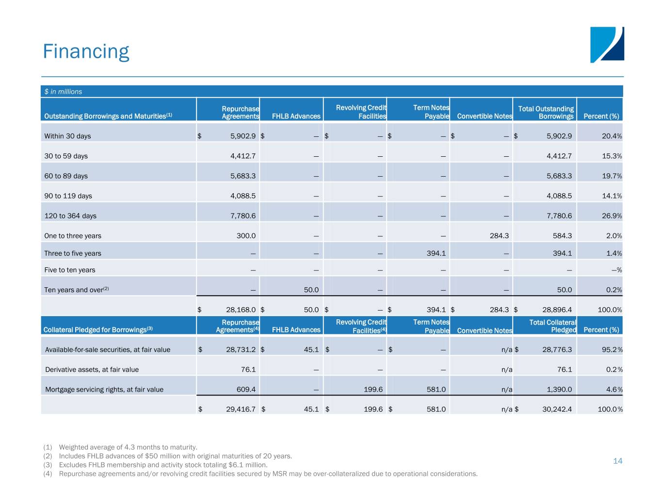 Financing $ in millions Repurchase Revolving Credit Term Notes Total Outstanding Outstanding Borrowings and Maturities(1) Agreements FHLB Advances Facilities Payable Convertible Notes Borrowings Percent (%) Within 30 days $ 5,902.9 $ — $ — $ — $ — $ 5,902.9 20.4% 30 to 59 days 4,412.7 — — — — 4,412.7 15.3% 60 to 89 days 5,683.3 — — — — 5,683.3 19.7% 90 to 119 days 4,088.5 — — — — 4,088.5 14.1% 120 to 364 days 7,780.6 — — — — 7,780.6 26.9% One to three years 300.0 — — — 284.3 584.3 2.0% Three to five years — — — 394.1 — 394.1 1.4% Five to ten years — — — — — — —% Ten years and over(2) — 50.0 — — — 50.0 0.2% $ 28,168.0 $ 50.0 $ — $ 394.1 $ 284.3 $ 28,896.4 100.0% Repurchase Revolving Credit Term Notes Total Collateral Collateral Pledged for Borrowings(3) Agreements(4) FHLB Advances Facilities(4) Payable Convertible Notes Pledged Percent (%) Available-for-sale securities, at fair value $ 28,731.2 $ 45.1 $ — $ — n/a $ 28,776.3 95.2% Derivative assets, at fair value 76.1 — — — n/a 76.1 0.2% Mortgage servicing rights, at fair value 609.4 — 199.6 581.0 n/a 1,390.0 4.6% $ 29,416.7 $ 45.1 $ 199.6 $ 581.0 n/a $ 30,242.4 100.0% (1) Weighted average of 4.3 months to maturity. (2) Includes FHLB advances of $50 million with original maturities of 20 years. (3) Excludes FHLB membership and activity stock totaling $6.1 million. 14 (4) Repurchase agreements and/or revolving credit facilities secured by MSR may be over-collateralized due to operational considerations.