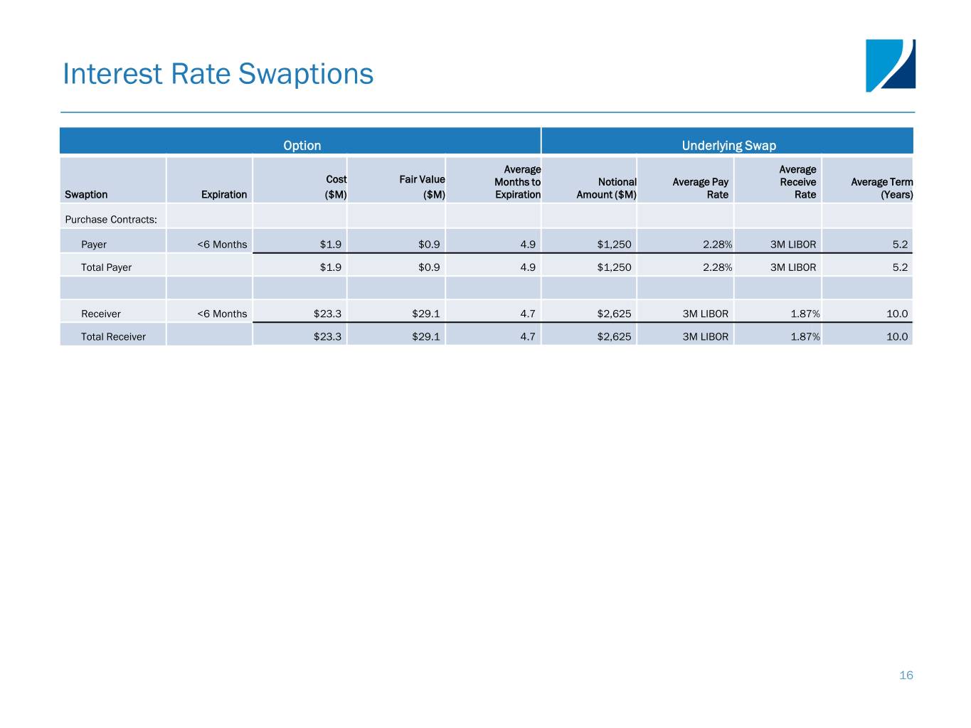 Interest Rate Swaptions Option Underlying Swap Average Average Cost Fair Value Months to Notional Average Pay Receive Average Term Swaption Expiration ($M) ($M) Expiration Amount ($M) Rate Rate (Years) Purchase Contracts: Payer <6 Months $1.9 $0.9 4.9 $1,250 2.28% 3M LIBOR 5.2 Total Payer $1.9 $0.9 4.9 $1,250 2.28% 3M LIBOR 5.2 Receiver <6 Months $23.3 $29.1 4.7 $2,625 3M LIBOR 1.87% 10.0 Total Receiver $23.3 $29.1 4.7 $2,625 3M LIBOR 1.87% 10.0 16