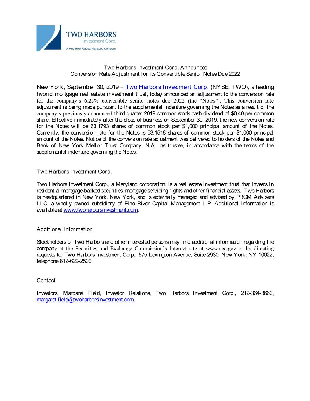 Two Harbors Investment Corp. Announces Conversion Rate Adjustment for its Convertible Senior Notes Due 2022 New York, September 30, 2019 – Two Harbors Investment Corp. (NYSE: TWO), a leading hybrid mortgage real estate investment trust, today announced an adjustment to the conversion rate for the company’s 6.25% convertible senior notes due 2022 (the “Notes”). This conversion rate adjustment is being made pursuant to the supplemental indenture governing the Notes as a result of the company’s previously announced third quarter 2019 common stock cash dividend of $0.40 per common share. Effective immediately after the close of business on September 30, 2019, the new conversion rate for the Notes will be 63.1793 shares of common stock per $1,000 principal amount of the Notes. Currently, the conversion rate for the Notes is 63.1518 shares of common stock per $1,000 principal amount of the Notes. Notice of the conversion rate adjustment was delivered to holders of the Notes and Bank of New York Mellon Trust Company, N.A., as trustee, in accordance with the terms of the supplemental indenture governing the Notes. Two Harbors Investment Corp. Two Harbors Investment Corp., a Maryland corporation, is a real estate investment trust that invests in residential mortgage-backed securities, mortgage servicing rights and other financial assets. Two Harbors is headquartered in New York, New York, and is externally managed and advised by PRCM Advisers LLC, a wholly owned subsidiary of Pine River Capital Management L.P. Additional information is available at www.twoharborsinvestment.com. Additional Information Stockholders of Two Harbors and other interested persons may find additional information regarding the company at the Securities and Exchange Commission’s Internet site at www.sec.gov or by directing requests to: Two Harbors Investment Corp., 575 Lexington Avenue, Suite 2930, New York, NY 10022, telephone 612-629-2500. Contact Investors: Margaret Field, Investor Relations, Two Harbors Investment Corp., 212-364-3663, margaret.field@twoharborsinvestment.com.