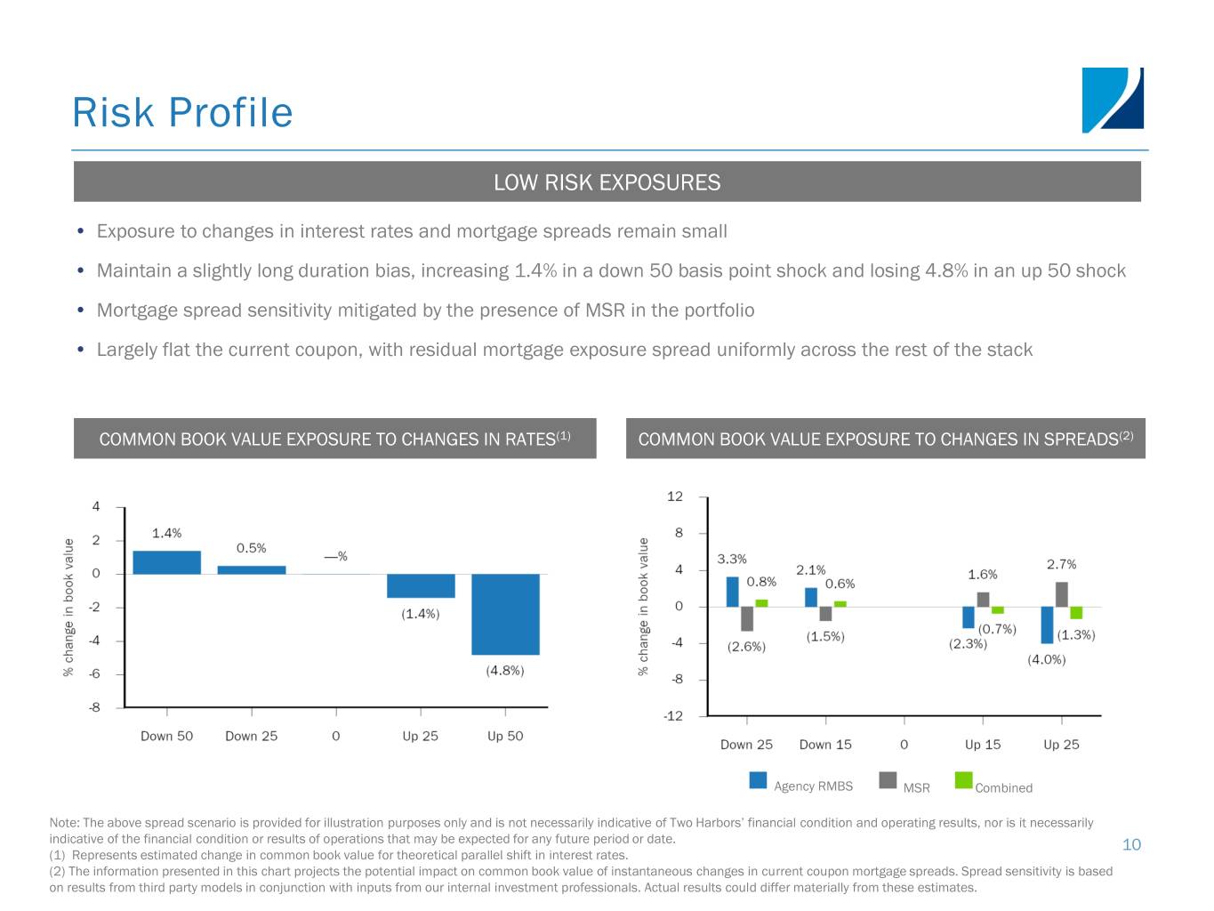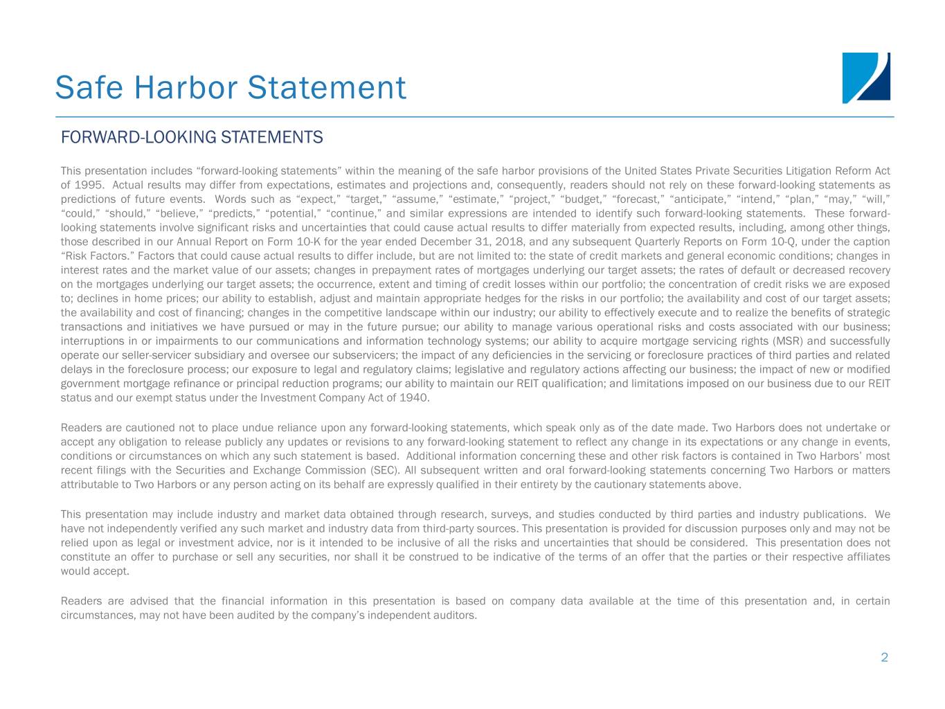 Safe Harbor Statement FORWARD-LOOKING STATEMENTS This presentation includes “forward-looking statements” within the meaning of the safe harbor provisions of the United States Private Securities Litigation Reform Act of 1995. Actual results may differ from expectations, estimates and projections and, consequently, readers should not rely on these forward-looking statements as predictions of future events. Words such as “expect,” “target,” “assume,” “estimate,” “project,” “budget,” “forecast,” “anticipate,” “intend,” “plan,” “may,” “will,” “could,” “should,” “believe,” “predicts,” “potential,” “continue,” and similar expressions are intended to identify such forward-looking statements. These forward- looking statements involve significant risks and uncertainties that could cause actual results to differ materially from expected results, including, among other things, those described in our Annual Report on Form 10-K for the year ended December 31, 2018, and any subsequent Quarterly Reports on Form 10-Q, under the caption “Risk Factors.” Factors that could cause actual results to differ include, but are not limited to: the state of credit markets and general economic conditions; changes in interest rates and the market value of our assets; changes in prepayment rates of mortgages underlying our target assets; the rates of default or decreased recovery on the mortgages underlying our target assets; the occurrence, extent and timing of credit losses within our portfolio; the concentration of credit risks we are exposed to; declines in home prices; our ability to establish, adjust and maintain appropriate hedges for the risks in our portfolio; the availability and cost of our target assets; the availability and cost of financing; changes in the competitive landscape within our industry; our ability to effectively execute and to realize the benefits of strategic transactions and initiatives we have pursued or may in the future pursue; our ability to manage various operational risks and costs associated with our business; interruptions in or impairments to our communications and information technology systems; our ability to acquire mortgage servicing rights (MSR) and successfully operate our seller-servicer subsidiary and oversee our subservicers; the impact of any deficiencies in the servicing or foreclosure practices of third parties and related delays in the foreclosure process; our exposure to legal and regulatory claims; legislative and regulatory actions affecting our business; the impact of new or modified government mortgage refinance or principal reduction programs; our ability to maintain our REIT qualification; and limitations imposed on our business due to our REIT status and our exempt status under the Investment Company Act of 1940. Readers are cautioned not to place undue reliance upon any forward-looking statements, which speak only as of the date made. Two Harbors does not undertake or accept any obligation to release publicly any updates or revisions to any forward-looking statement to reflect any change in its expectations or any change in events, conditions or circumstances on which any such statement is based. Additional information concerning these and other risk factors is contained in Two Harbors’ most recent filings with the Securities and Exchange Commission (SEC). All subsequent written and oral forward-looking statements concerning Two Harbors or matters attributable to Two Harbors or any person acting on its behalf are expressly qualified in their entirety by the cautionary statements above. This presentation may include industry and market data obtained through research, surveys, and studies conducted by third parties and industry publications. We have not independently verified any such market and industry data from third-party sources. This presentation is provided for discussion purposes only and may not be relied upon as legal or investment advice, nor is it intended to be inclusive of all the risks and uncertainties that should be considered. This presentation does not constitute an offer to purchase or sell any securities, nor shall it be construed to be indicative of the terms of an offer that the parties or their respective affiliates would accept. Readers are advised that the financial information in this presentation is based on company data available at the time of this presentation and, in certain circumstances, may not have been audited by the company’s independent auditors. 2