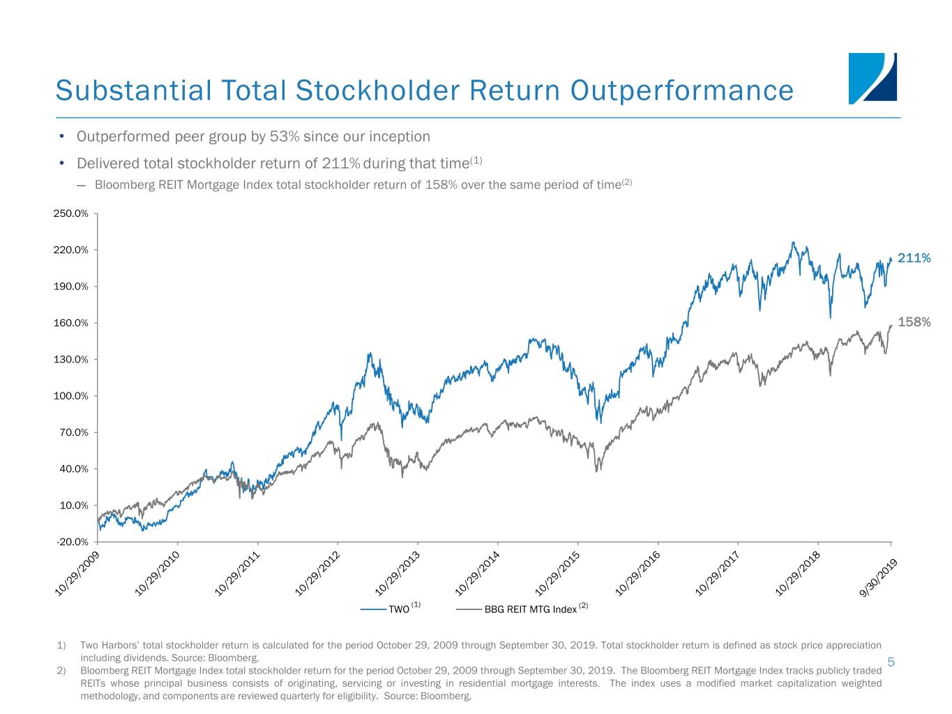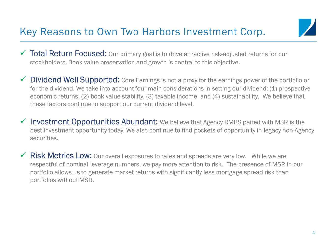 Two Harbors Investment Corp. Overview(1) LEADING RESIDENTIAL HYBRID MORTGAGE REIT $3.9 billion(2) $5.0 billion $30.0 billion hybrid portfolio comprised of Rates market capitalization total stockholders’ equity and Credit strategies(3) 211% 11.4% total stockholder return since book value growth since our our inception(4) inception in 2009(5) KEY DIFFERENTIATING FACTORS Strategy of pairing MSR with Agency RMBS Utilize variety of instruments to hedge interest rate exposure Unique portfolio of legacy non-Agency securities 1) Except as otherwise indicated in this presentation, reported data is as of or for the period ended September 30, 2019. 2) Market capitalization as of November 18, 2019. 3) Assets in “Rates” include Agency RMBS, MSR and other interest rate sensitive assets. Assets in “Credit” include non-Agency securities and other credit sensitive assets. 4) Two Harbors’ total stockholder return calculated for the period October 29, 2009 through September 30, 2019. Total stockholder return is defined as stock price appreciation including dividends. Source: Bloomberg. 5) Book value growth since our inception is measured from December 31, 2009 through September 30, 2019. Two Harbors quarterly book values have been adjusted for each quarter from Q1 3 2013 forward to include $1.88 of stock distributions associated with the special dividend of Silver Bay Realty Trust (“Silver Bay”) and, beginning in Q4 2017, $3.67 of stock distributions associated with the special dividend of Granite Point Mortgage Trust Inc. (“Granite Point”) common stock. Source: Bloomberg.