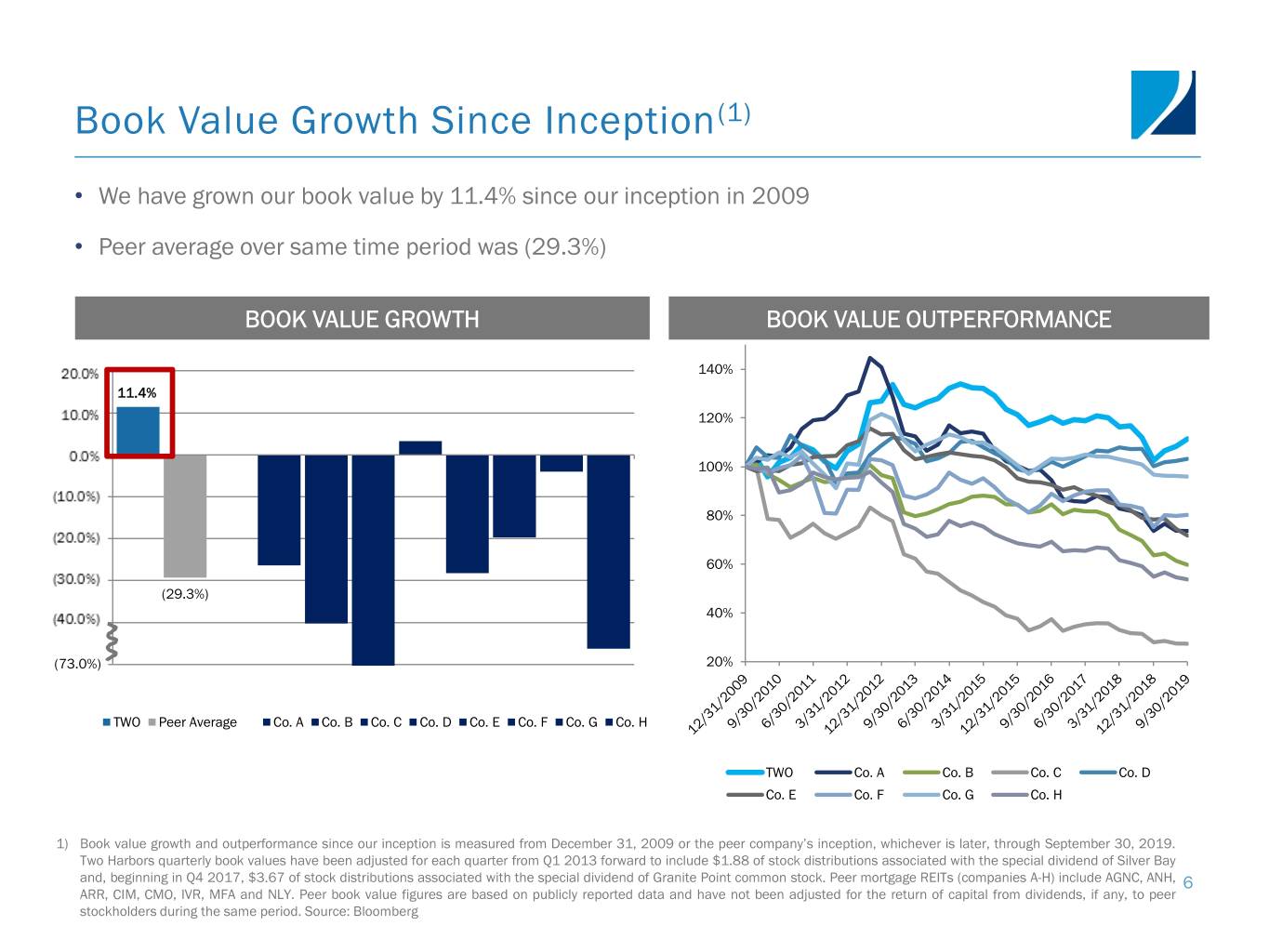 Substantial Total Stockholder Return Outperformance • Outperformed peer group by 53% since our inception • Delivered total stockholder return of 211% during that time(1) ― Bloomberg REIT Mortgage Index total stockholder return of 158% over the same period of time(2) 250.0% 220.0% 211% 190.0% 160.0% 158% 130.0% 100.0% 70.0% 40.0% 10.0% -20.0% TWO (1) BBG REIT MTG Index (2) 1) Two Harbors’ total stockholder return is calculated for the period October 29, 2009 through September 30, 2019. Total stockholder return is defined as stock price appreciation including dividends. Source: Bloomberg. 5 2) Bloomberg REIT Mortgage Index total stockholder return for the period October 29, 2009 through September 30, 2019. The Bloomberg REIT Mortgage Index tracks publicly traded REITs whose principal business consists of originating, servicing or investing in residential mortgage interests. The index uses a modified market capitalization weighted methodology, and components are reviewed quarterly for eligibility. Source: Bloomberg.