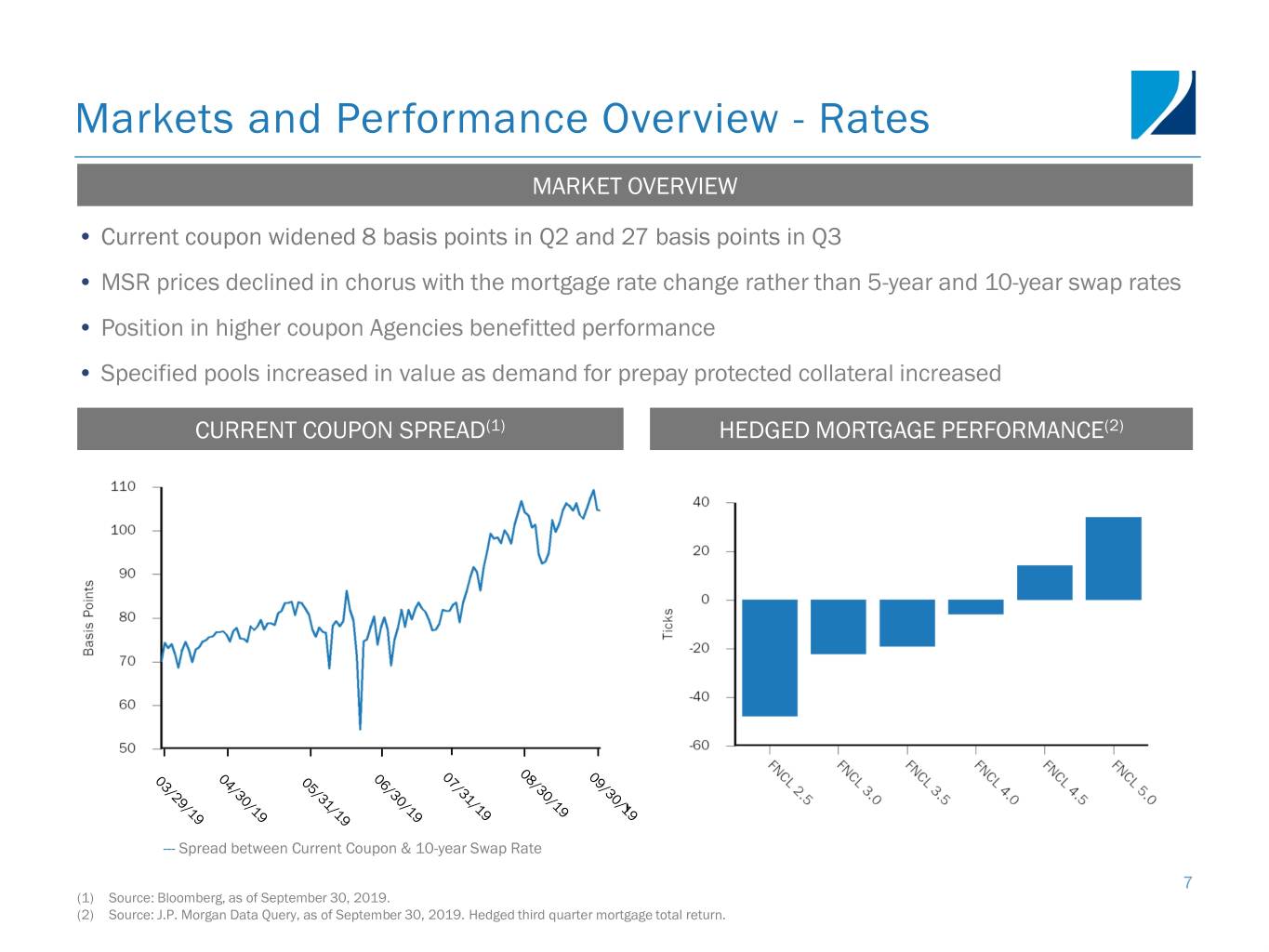 Book Value Growth Since Inception(1) • We have grown our book value by 11.4% since our inception in 2009 • Peer average over same time period was (29.3%) BOOK VALUE GROWTH BOOK VALUE OUTPERFORMANCE 140% 11.4% 120% 100% 80% 60% (29.3%) 40% (73.0%) 20% TWO Peer Average Co. A Co. B Co. C Co. D Co. E Co. F Co. G Co. H TWO Co. A Co. B Co. C Co. D Co. E Co. F Co. G Co. H 1) Book value growth and outperformance since our inception is measured from December 31, 2009 or the peer company’s inception, whichever is later, through September 30, 2019. Two Harbors quarterly book values have been adjusted for each quarter from Q1 2013 forward to include $1.88 of stock distributions associated with the special dividend of Silver Bay and, beginning in Q4 2017, $3.67 of stock distributions associated with the special dividend of Granite Point common stock. Peer mortgage REITs (companies A-H) include AGNC, ANH, 6 ARR, CIM, CMO, IVR, MFA and NLY. Peer book value figures are based on publicly reported data and have not been adjusted for the return of capital from dividends, if any, to peer stockholders during the same period. Source: Bloomberg