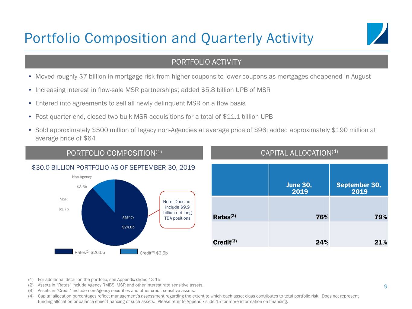 Markets and Performance Overview - Credit MARKET OVERVIEW • Low mortgage rates have offset steadily increasing HPA, keeping affordability within recent context • This should allow for increased mobility, higher prepayments, and better overall expected returns • Declining losses over time have provided important tailwind to performance of subprime securities • Portfolio severities are lower than market, indicating superior security selection AFFORDABILITY(1) HISTORICAL LOSS SEVERITIES(2) --- Affordability --- Case-Shiller HPI - - - Affordability index --- TWO subprime severities --- Subprime market severities (1) Source: Nomura Securities International research, CoreLogic, National Association of Realtors, Freddie Mac and Haver as of September 16, 2019. 8 (2) Source: Two Harbors’ portfolio data and CoreLogic, as of September 1, 2019.