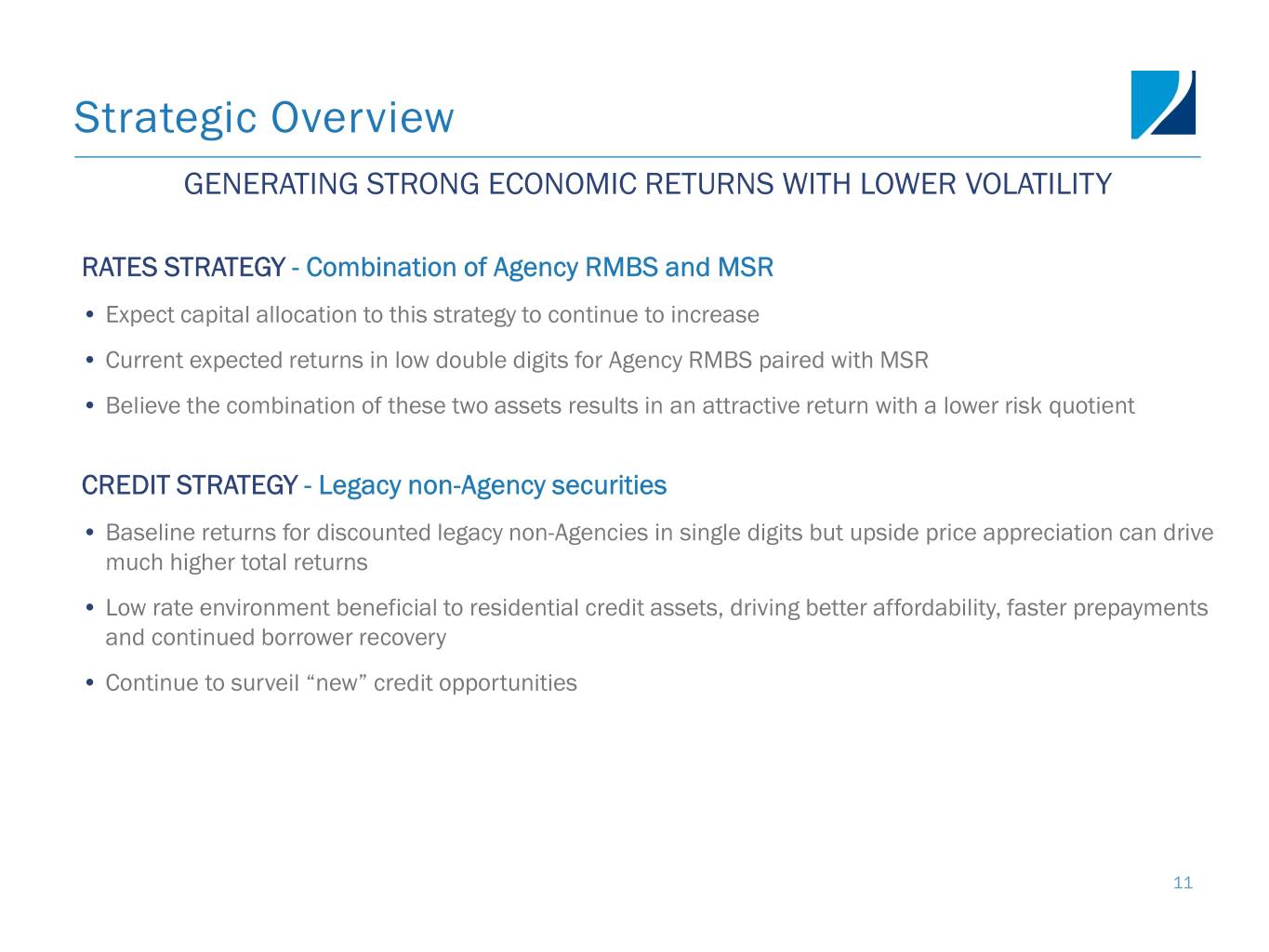 Risk Profile LOW RISK EXPOSURES • Exposure to changes in interest rates and mortgage spreads remain small • Maintain a slightly long duration bias, increasing 1.4% in a down 50 basis point shock and losing 4.8% in an up 50 shock • Mortgage spread sensitivity mitigated by the presence of MSR in the portfolio • Largely flat the current coupon, with residual mortgage exposure spread uniformly across the rest of the stack COMMON BOOK VALUE EXPOSURE TO CHANGES IN RATES(1) COMMON BOOK VALUE EXPOSURE TO CHANGES IN SPREADS(2) Agency RMBS MSR Combined Note: The above spread scenario is provided for illustration purposes only and is not necessarily indicative of Two Harbors’ financial condition and operating results, nor is it necessarily indicative of the financial condition or results of operations that may be expected for any future period or date. 10 (1) Represents estimated change in common book value for theoretical parallel shift in interest rates. (2) The information presented in this chart projects the potential impact on common book value of instantaneous changes in current coupon mortgage spreads. Spread sensitivity is based on results from third party models in conjunction with inputs from our internal investment professionals. Actual results could differ materially from these estimates.