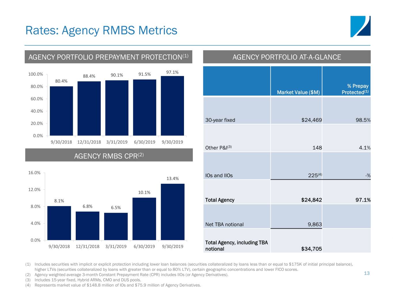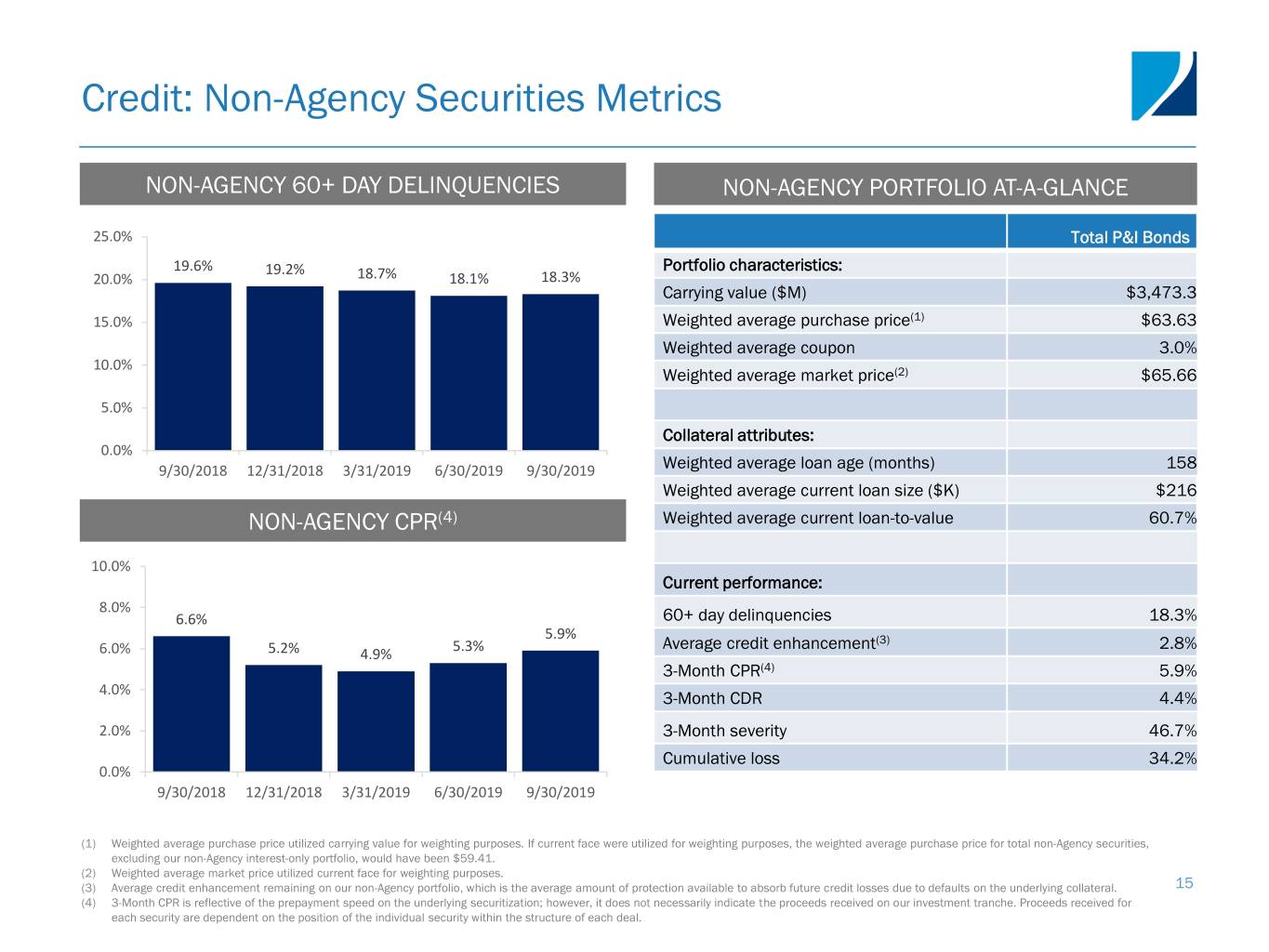 Credit: Non-Agency Securities Metrics NON-AGENCY 60+ DAY DELINQUENCIES NON-AGENCY PORTFOLIO AT-A-GLANCE 25.0% Total P&I Bonds 19.6% 19.2% Portfolio characteristics: 20.0% 18.7% 18.1% 18.3% Carrying value ($M) $3,473.3 15.0% Weighted average purchase price(1) $63.63 Weighted average coupon 3.0% 10.0% Weighted average market price(2) $65.66 5.0% Collateral attributes: 0.0% Weighted average loan age (months) 158 9/30/2018 12/31/2018 3/31/2019 6/30/2019 9/30/2019 Weighted average current loan size ($K) $216 NON-AGENCY CPR(4) Weighted average current loan-to-value 60.7% 10.0% Current performance: 8.0% 6.6% 60+ day delinquencies 18.3% 5.9% 5.3% Average credit enhancement(3) 2.8% 6.0% 5.2% 4.9% 3-Month CPR(4) 5.9% 4.0% 3-Month CDR 4.4% 2.0% 3-Month severity 46.7% Cumulative loss 34.2% 0.0% 9/30/2018 12/31/2018 3/31/2019 6/30/2019 9/30/2019 (1) Weighted average purchase price utilized carrying value for weighting purposes. If current face were utilized for weighting purposes, the weighted average purchase price for total non-Agency securities, excluding our non-Agency interest-only portfolio, would have been $59.41. (2) Weighted average market price utilized current face for weighting purposes. (3) Average credit enhancement remaining on our non-Agency portfolio, which is the average amount of protection available to absorb future credit losses due to defaults on the underlying collateral. 15 (4) 3-Month CPR is reflective of the prepayment speed on the underlying securitization; however, it does not necessarily indicate the proceeds received on our investment tranche. Proceeds received for each security are dependent on the position of the individual security within the structure of each deal.