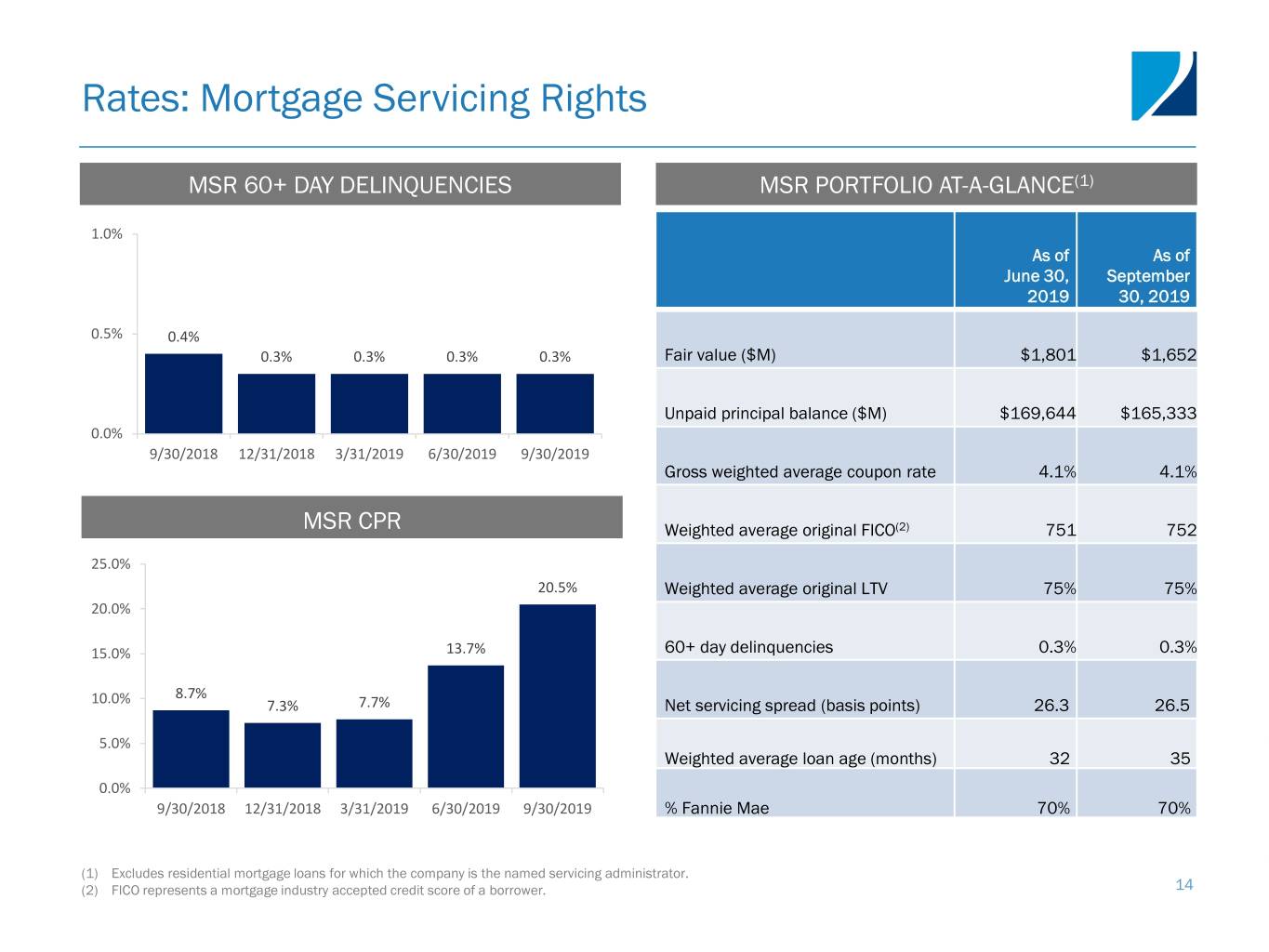 Rates: Mortgage Servicing Rights MSR 60+ DAY DELINQUENCIES MSR PORTFOLIO AT-A-GLANCE(1) 1.0% As of As of June 30, September 2019 30, 2019 0.5% 0.4% 0.3% 0.3% 0.3% 0.3% Fair value ($M) $1,801 $1,652 Unpaid principal balance ($M) $169,644 $165,333 0.0% 9/30/2018 12/31/2018 3/31/2019 6/30/2019 9/30/2019 Gross weighted average coupon rate 4.1% 4.1% MSR CPR Weighted average original FICO(2) 751 752 25.0% 20.5% Weighted average original LTV 75% 75% 20.0% 15.0% 13.7% 60+ day delinquencies 0.3% 0.3% 8.7% 10.0% 7.3% 7.7% Net servicing spread (basis points) 26.3 26.5 5.0% Weighted average loan age (months) 32 35 0.0% 9/30/2018 12/31/2018 3/31/2019 6/30/2019 9/30/2019 % Fannie Mae 70% 70% (1) Excludes residential mortgage loans for which the company is the named servicing administrator. (2) FICO represents a mortgage industry accepted credit score of a borrower. 14