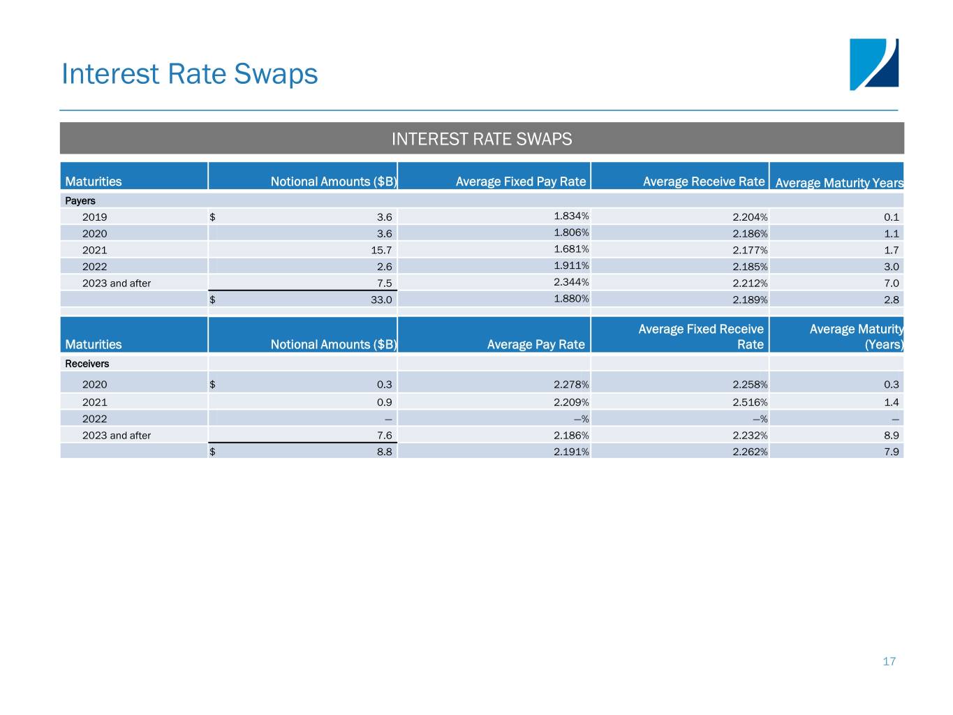 Interest Rate Swaps INTEREST RATE SWAPS Maturities Notional Amounts ($B) Average Fixed Pay Rate Average Receive Rate Average Maturity Years Payers 2019 $ 3.6 1.834% 2.204% 0.1 2020 3.6 1.806% 2.186% 1.1 2021 15.7 1.681% 2.177% 1.7 2022 2.6 1.911% 2.185% 3.0 2023 and after 7.5 2.344% 2.212% 7.0 $ 33.0 1.880% 2.189% 2.8 Average Fixed Receive Average Maturity Maturities Notional Amounts ($B) Average Pay Rate Rate (Years) Receivers 2020 $ 0.3 2.278% 2.258% 0.3 2021 0.9 2.209% 2.516% 1.4 2022 — —% —% — 2023 and after 7.6 2.186% 2.232% 8.9 $ 8.8 2.191% 2.262% 7.9 17