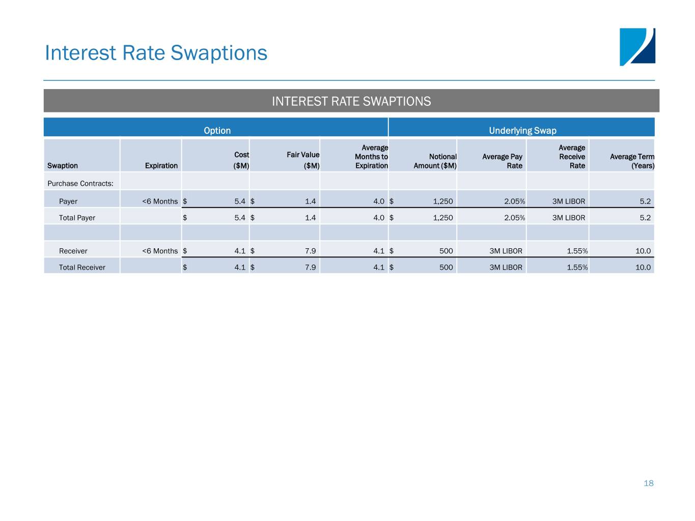 Interest Rate Swaptions INTEREST RATE SWAPTIONS Option Underlying Swap Average Average Cost Fair Value Months to Notional Average Pay Receive Average Term Swaption Expiration ($M) ($M) Expiration Amount ($M) Rate Rate (Years) Purchase Contracts: Payer <6 Months $ 5.4 $ 1.4 4.0 $ 1,250 2.05% 3M LIBOR 5.2 Total Payer $ 5.4 $ 1.4 4.0 $ 1,250 2.05% 3M LIBOR 5.2 Receiver <6 Months $ 4.1 $ 7.9 4.1 $ 500 3M LIBOR 1.55% 10.0 Total Receiver $ 4.1 $ 7.9 4.1 $ 500 3M LIBOR 1.55% 10.0 18