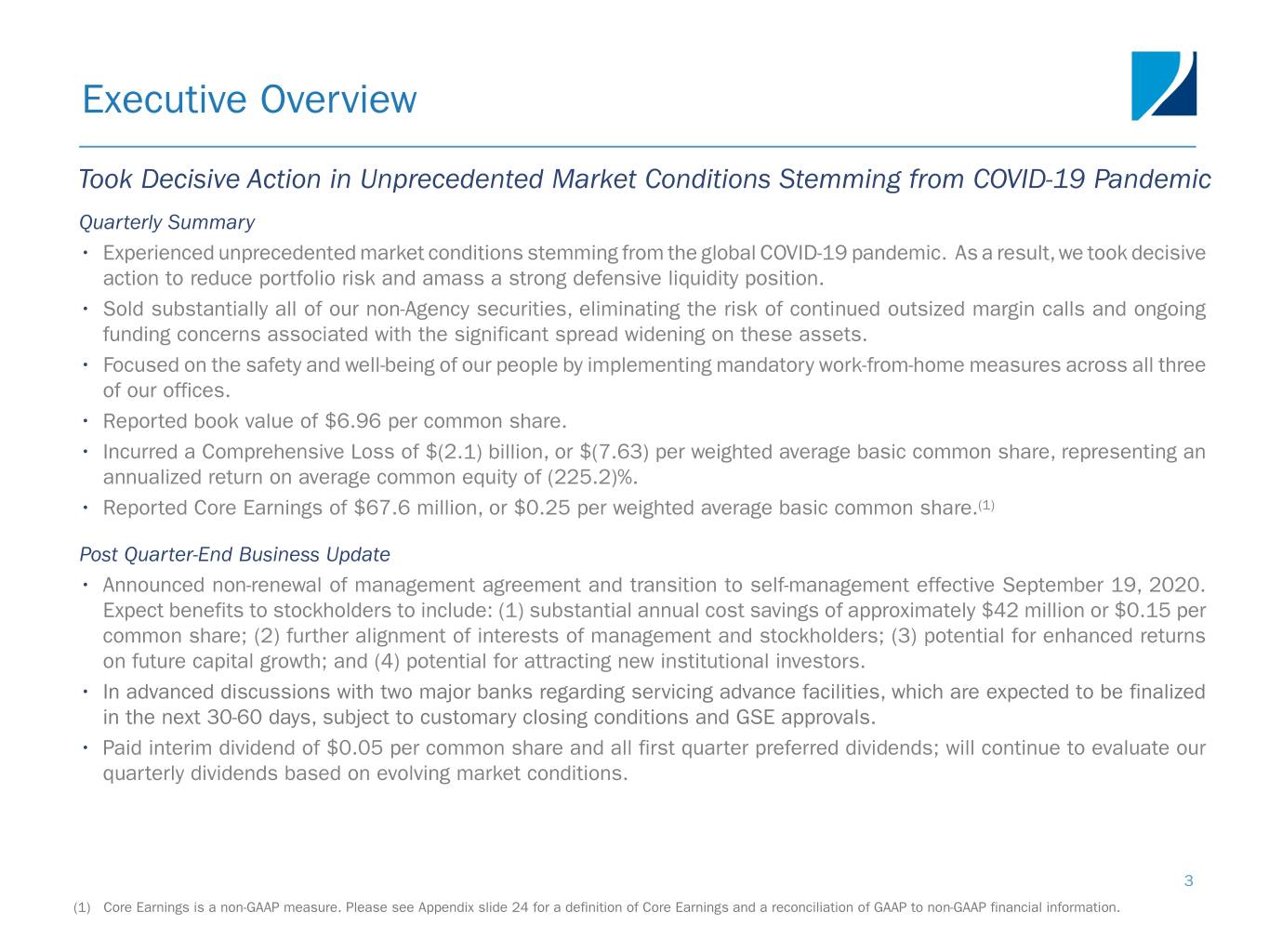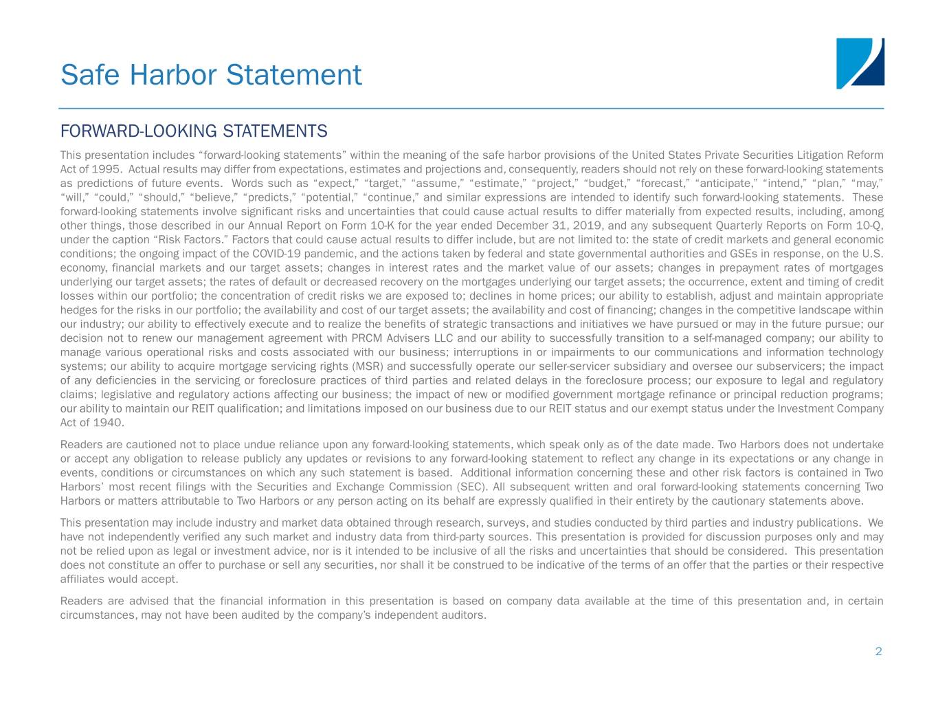 Safe Harbor Statement FORWARD-LOOKING STATEMENTS This presentation includes “forward-looking statements” within the meaning of the safe harbor provisions of the United States Private Securities Litigation Reform Act of 1995. Actual results may differ from expectations, estimates and projections and, consequently, readers should not rely on these forward-looking statements as predictions of future events. Words such as “expect,” “target,” “assume,” “estimate,” “project,” “budget,” “forecast,” “anticipate,” “intend,” “plan,” “may,” “will,” “could,” “should,” “believe,” “predicts,” “potential,” “continue,” and similar expressions are intended to identify such forward-looking statements. These forward-looking statements involve significant risks and uncertainties that could cause actual results to differ materially from expected results, including, among other things, those described in our Annual Report on Form 10-K for the year ended December 31, 2019, and any subsequent Quarterly Reports on Form 10-Q, under the caption “Risk Factors.” Factors that could cause actual results to differ include, but are not limited to: the state of credit markets and general economic conditions; the ongoing impact of the COVID-19 pandemic, and the actions taken by federal and state governmental authorities and GSEs in response, on the U.S. economy, financial markets and our target assets; changes in interest rates and the market value of our assets; changes in prepayment rates of mortgages underlying our target assets; the rates of default or decreased recovery on the mortgages underlying our target assets; the occurrence, extent and timing of credit losses within our portfolio; the concentration of credit risks we are exposed to; declines in home prices; our ability to establish, adjust and maintain appropriate hedges for the risks in our portfolio; the availability and cost of our target assets; the availability and cost of financing; changes in the competitive landscape within our industry; our ability to effectively execute and to realize the benefits of strategic transactions and initiatives we have pursued or may in the future pursue; our decision not to renew our management agreement with PRCM Advisers LLC and our ability to successfully transition to a self-managed company; our ability to manage various operational risks and costs associated with our business; interruptions in or impairments to our communications and information technology systems; our ability to acquire mortgage servicing rights (MSR) and successfully operate our seller-servicer subsidiary and oversee our subservicers; the impact of any deficiencies in the servicing or foreclosure practices of third parties and related delays in the foreclosure process; our exposure to legal and regulatory claims; legislative and regulatory actions affecting our business; the impact of new or modified government mortgage refinance or principal reduction programs; our ability to maintain our REIT qualification; and limitations imposed on our business due to our REIT status and our exempt status under the Investment Company Act of 1940. Readers are cautioned not to place undue reliance upon any forward-looking statements, which speak only as of the date made. Two Harbors does not undertake or accept any obligation to release publicly any updates or revisions to any forward-looking statement to reflect any change in its expectations or any change in events, conditions or circumstances on which any such statement is based. Additional information concerning these and other risk factors is contained in Two Harbors’ most recent filings with the Securities and Exchange Commission (SEC). All subsequent written and oral forward-looking statements concerning Two Harbors or matters attributable to Two Harbors or any person acting on its behalf are expressly qualified in their entirety by the cautionary statements above. This presentation may include industry and market data obtained through research, surveys, and studies conducted by third parties and industry publications. We have not independently verified any such market and industry data from third-party sources. This presentation is provided for discussion purposes only and may not be relied upon as legal or investment advice, nor is it intended to be inclusive of all the risks and uncertainties that should be considered. This presentation does not constitute an offer to purchase or sell any securities, nor shall it be construed to be indicative of the terms of an offer that the parties or their respective affiliates would accept. Readers are advised that the financial information in this presentation is based on company data available at the time of this presentation and, in certain circumstances, may not have been audited by the company’s independent auditors. 2