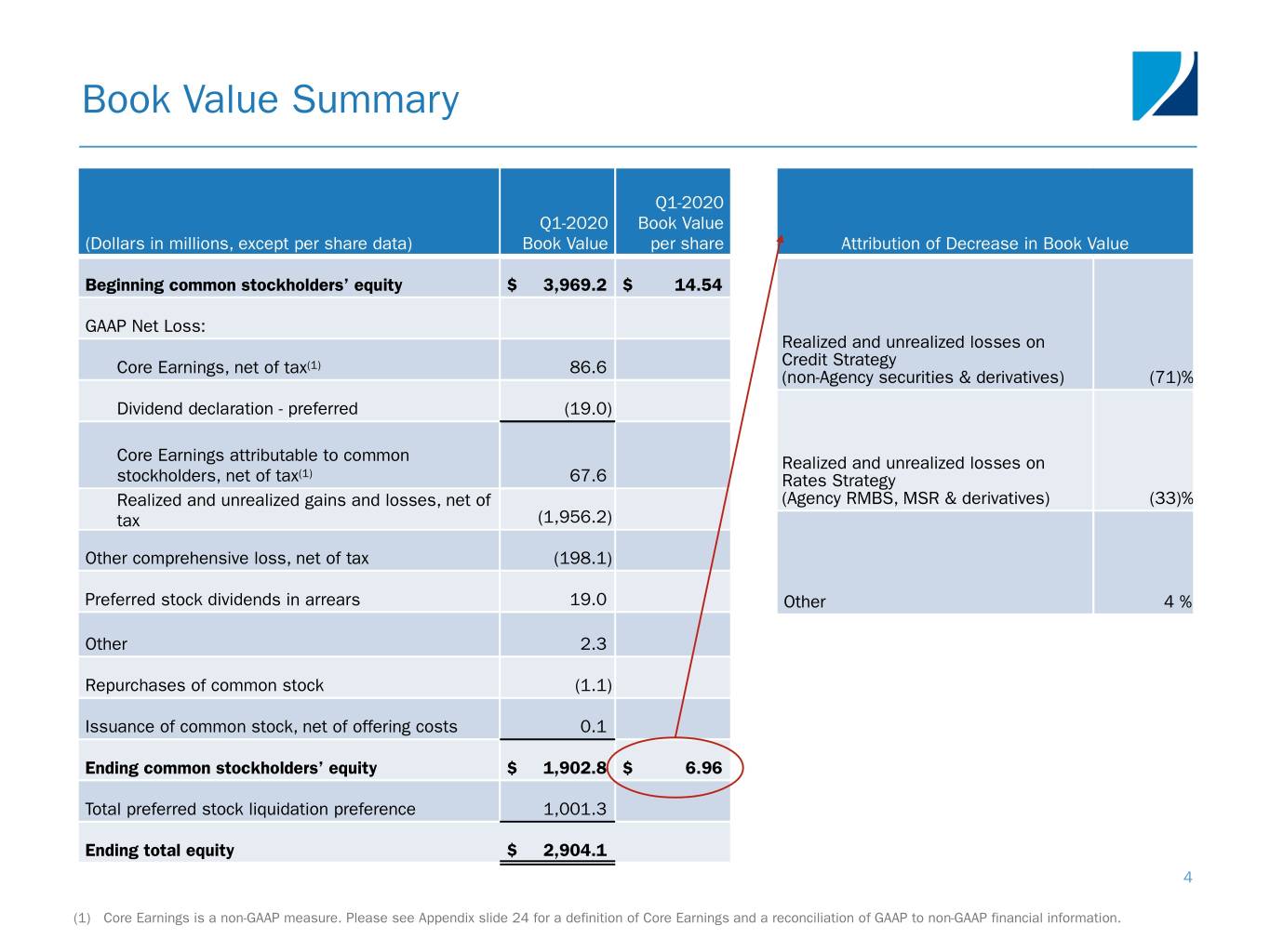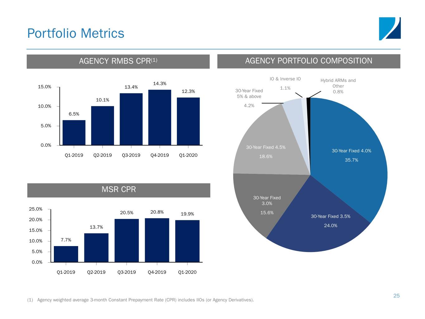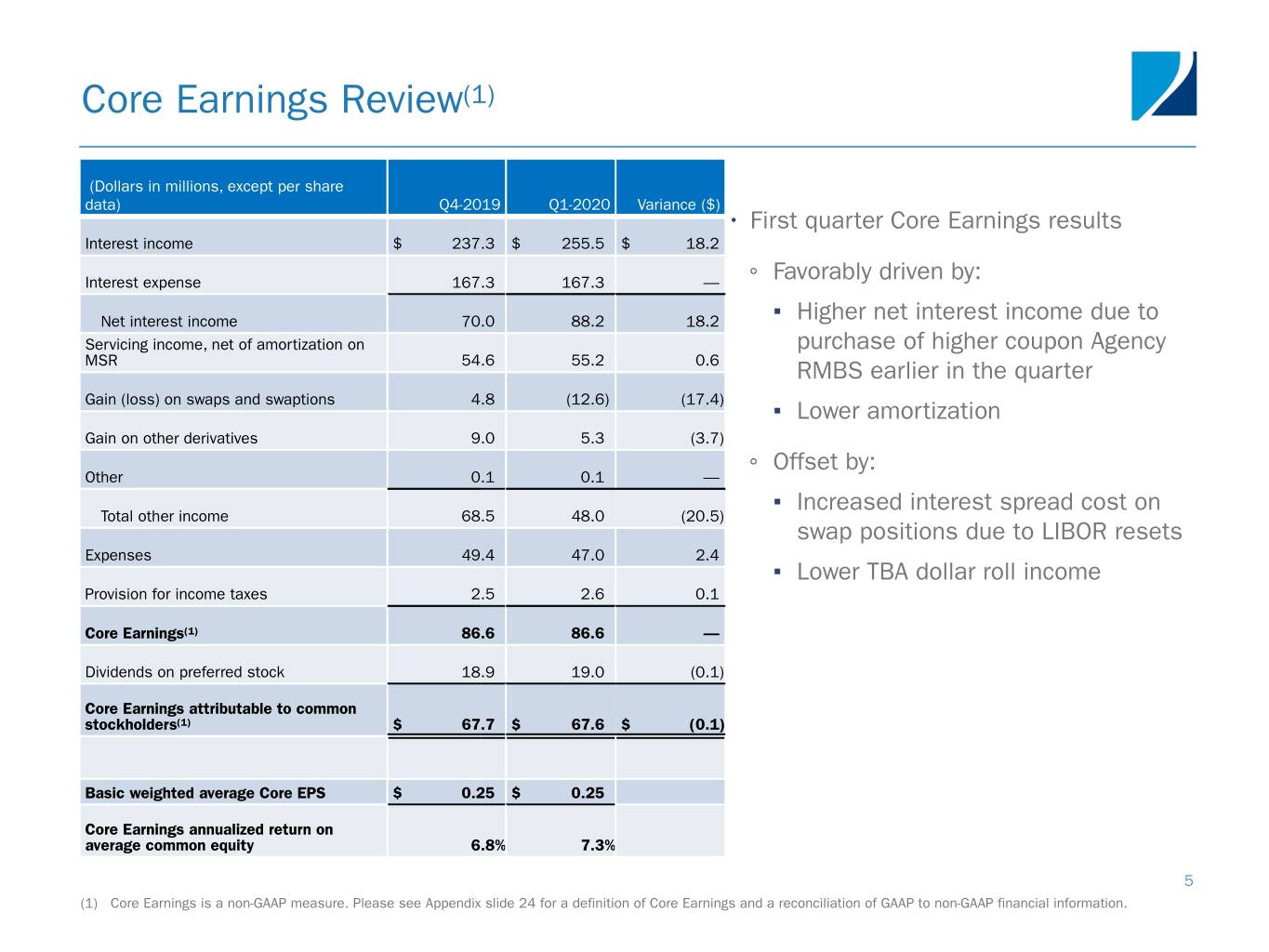 GAAP to Core Earnings Reconciliation(1) Reconciliation of GAAP to non-GAAP Information Three Months Ended Three Months Ended (In thousands, except for per common share data) December 31, 2019 March 31, 2020 Reconciliation of Comprehensive income (loss) to Core Earnings: Comprehensive income (loss) attributable to common stockholders $ 56,850 $ (2,086,676) Adjustment for other comprehensive loss attributable to common stockholders: Unrealized loss on available-for-sale securities 58,954 198,070 Net income (loss) attributable to common stockholders $ 115,804 $ (1,888,606) Adjustments for non-core earnings: Other-than-temporary impairments and loss recovery adjustments 2,198 — Realized (gain) loss on securities (27,615) 1,035,038 Unrealized (gain) loss on securities (526) 931 Provision for credit losses — 45,638 Realized and unrealized (gain) loss on mortgage servicing rights (51,387) 511,059 Realized loss (gain) on termination or expiration of swaps and swaptions 1,495 (361,853) Unrealized losses on interest rate swaps, caps and swaptions 10,148 599,834 Losses on other derivative instruments 19,833 138,819 Other loss (income) 73 (735) Change in servicing reserves 72 232 Non-cash equity compensation expense 2,423 2,315 Other nonrecurring expenses — 719 Net benefit from income taxes on non-Core Earnings (4,847) (15,774) Core Earnings attributable to common stockholders(1) $ 67,671 $ 67,617 Weighted average basic common shares 272,906,815 273,392,615 Core Earnings per weighted average basic common share $ 0.25 $ 0.25 (1) Core Earnings is a non-U.S. GAAP measure that we define as comprehensive (loss) income attributable to common stockholders, excluding “realized and unrealized gains and losses” (impairment losses, provision for credit losses, realized and unrealized gains and losses on the aggregate portfolio, reserve expense for representation and warranty obligations on MSR, non-cash compensation expense related to restricted common stock and other nonrecurring expenses). As defined, Core Earnings includes net interest income, accrual and settlement of interest on derivatives, dollar roll income on TBAs, servicing income, net of estimated amortization on MSR, management fees and recurring cash related operating expenses. Dollar roll income is the economic equivalent to holding and financing Agency RMBS using short-term repurchase agreements. Core Earnings provides supplemental information to assist investors in analyzing 24 the Company’s results of operations and helps facilitate comparisons to industry peers.