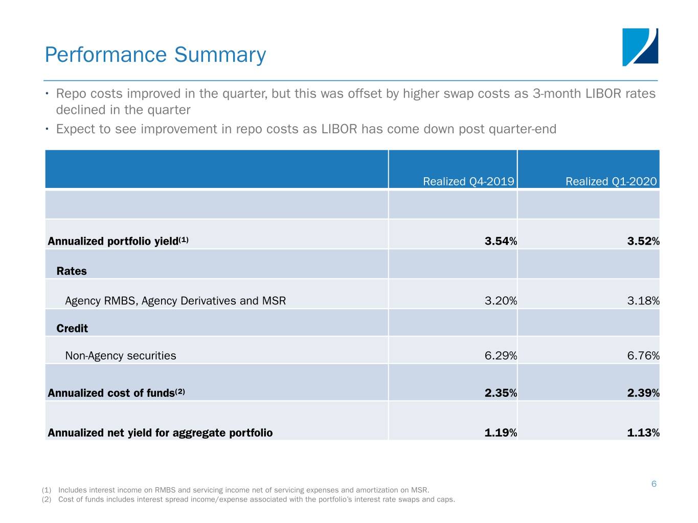 Core Earnings Review(1) (Dollars in millions, except per share data) Q4-2019 Q1-2020 Variance ($) • First quarter Core Earnings results Interest income $ 237.3 $ 255.5 $ 18.2 Interest expense 167.3 167.3 — ◦ Favorably driven by: Net interest income 70.0 88.2 18.2 ▪ Higher net interest income due to Servicing income, net of amortization on purchase of higher coupon Agency MSR 54.6 55.2 0.6 RMBS earlier in the quarter Gain (loss) on swaps and swaptions 4.8 (12.6) (17.4) ▪ Lower amortization Gain on other derivatives 9.0 5.3 (3.7) ◦ Offset by: Other 0.1 0.1 — ▪ Increased interest spread cost on Total other income 68.5 48.0 (20.5) swap positions due to LIBOR resets Expenses 49.4 47.0 2.4 ▪ Lower TBA dollar roll income Provision for income taxes 2.5 2.6 0.1 Core Earnings(1) 86.6 86.6 — Dividends on preferred stock 18.9 19.0 (0.1) Core Earnings attributable to common stockholders(1) $ 67.7 $ 67.6 $ (0.1) Basic weighted average Core EPS $ 0.25 $ 0.25 Core Earnings annualized return on average common equity 6.8% 7.3% 5 (1) Core Earnings is a non-GAAP measure. Please see Appendix slide 24 for a definition of Core Earnings and a reconciliation of GAAP to non-GAAP financial information.