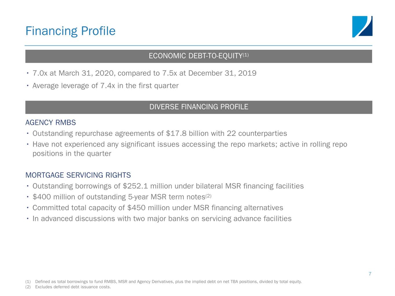 Performance Summary • Repo costs improved in the quarter, but this was offset by higher swap costs as 3-month LIBOR rates declined in the quarter • Expect to see improvement in repo costs as LIBOR has come down post quarter-end Realized Q4-2019 Realized Q1-2020 Annualized portfolio yield(1) 3.54% 3.52% Rates Agency RMBS, Agency Derivatives and MSR 3.20% 3.18% Credit Non-Agency securities 6.29% 6.76% Annualized cost of funds(2) 2.35% 2.39% Annualized net yield for aggregate portfolio 1.19% 1.13% 6 (1) Includes interest income on RMBS and servicing income net of servicing expenses and amortization on MSR. (2) Cost of funds includes interest spread income/expense associated with the portfolio’s interest rate swaps and caps.
